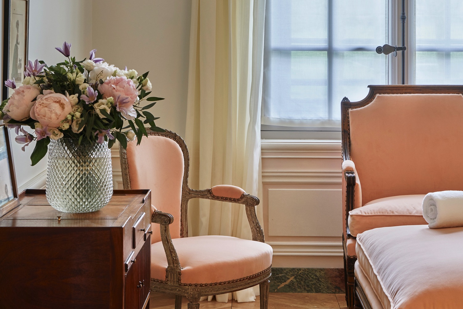 Die größte Suite, die ehemals der Privatsitz des Staatsmannes Jaques Necker war, beeindruckt mit vier Meter hohen Decken, einem Marmorkamin, einem großen Badezimmer und einem Himmelbett.
