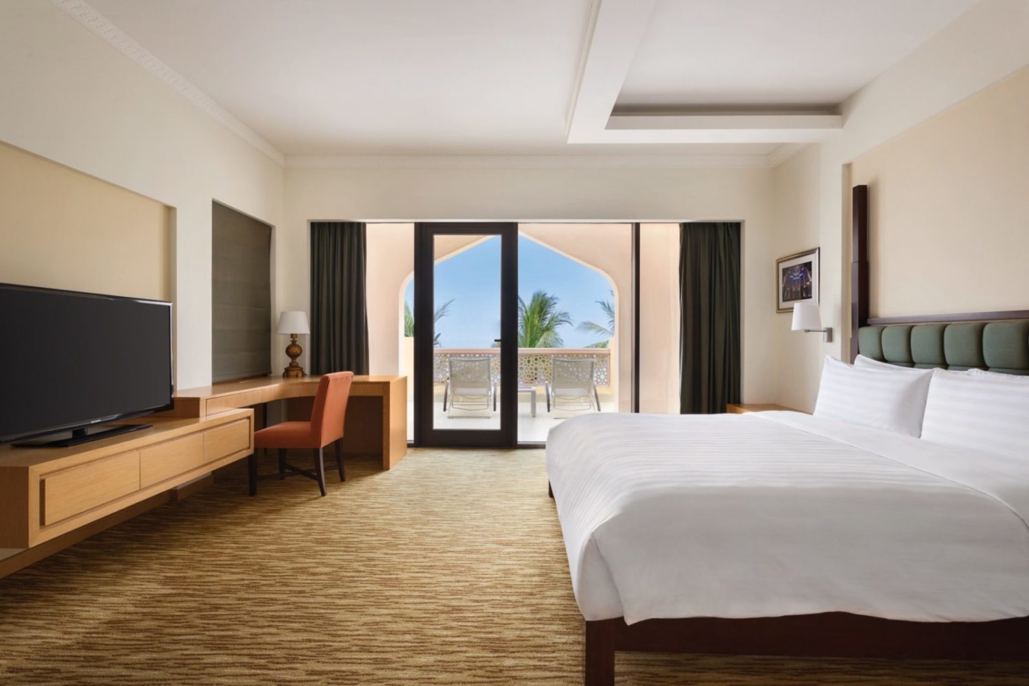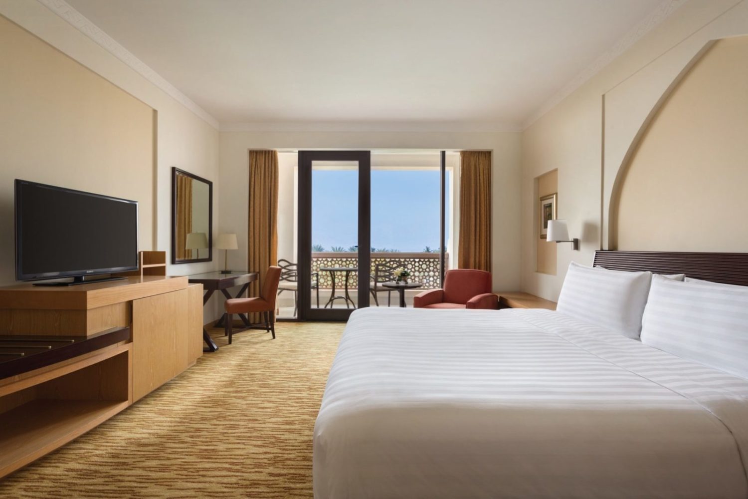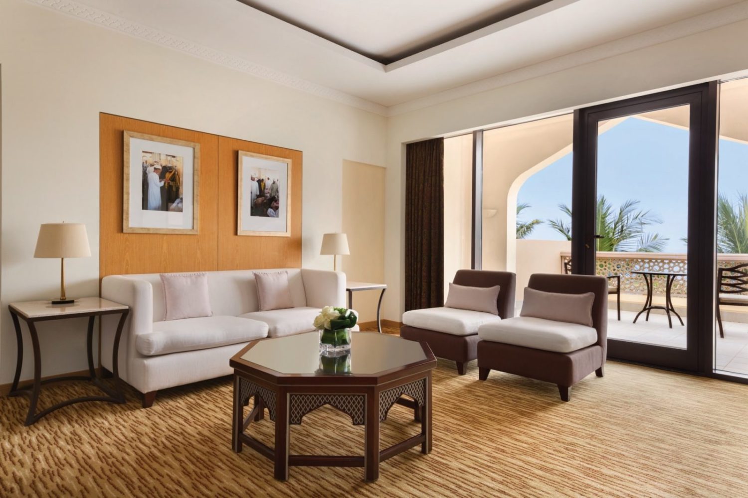 Die Al Bandar Specialty Suite verfügt über einen getrennten Wohn-/Schlafbereich, begehbarem Kleiderschrank sowie großem Balkon (14 qm). Zu den weiteren Annehmlichkeiten der Kategorie gehören Nespresso-Kaffeemaschine, iPod-Docking-Station, Obstkorb und Blumen zur Begrüßung sowie ausgewählte kostenlose Getränke in der Minibar. Blick über den Garten und den Golf von Oman.