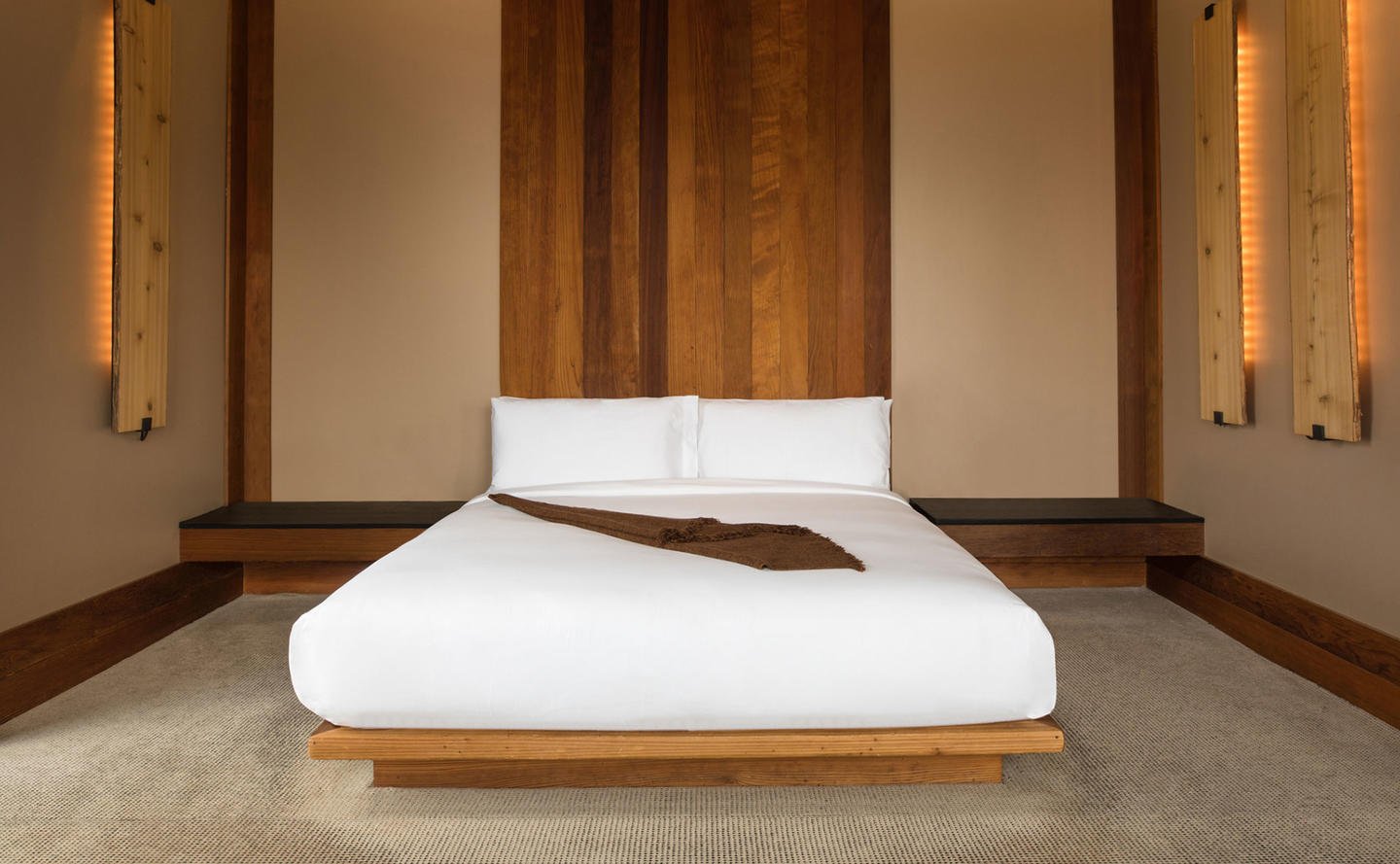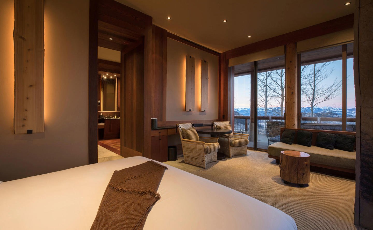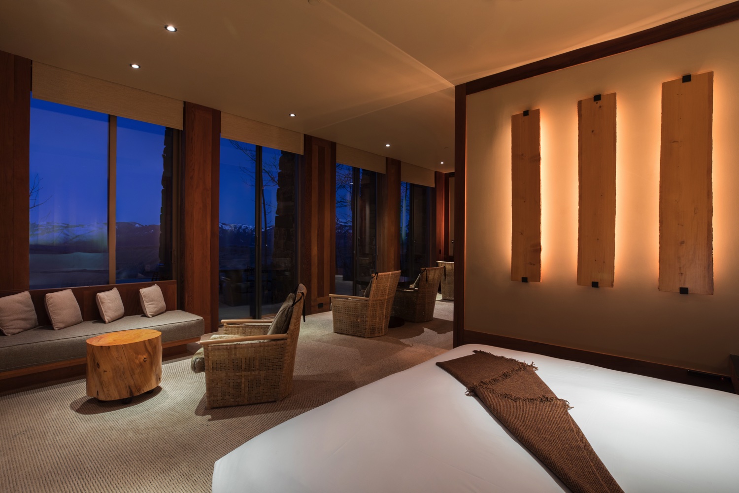 Mit ihren hohen Decken, Balkonen und großen Panoramafenstern, die den Blick auf die Teton-Berge einrahmen, sind die Suiten des Amangani mit Holz, Stein, gewebten Stühlen aus Kuhfell und Decken aus Wolfspelz eingerichtet.