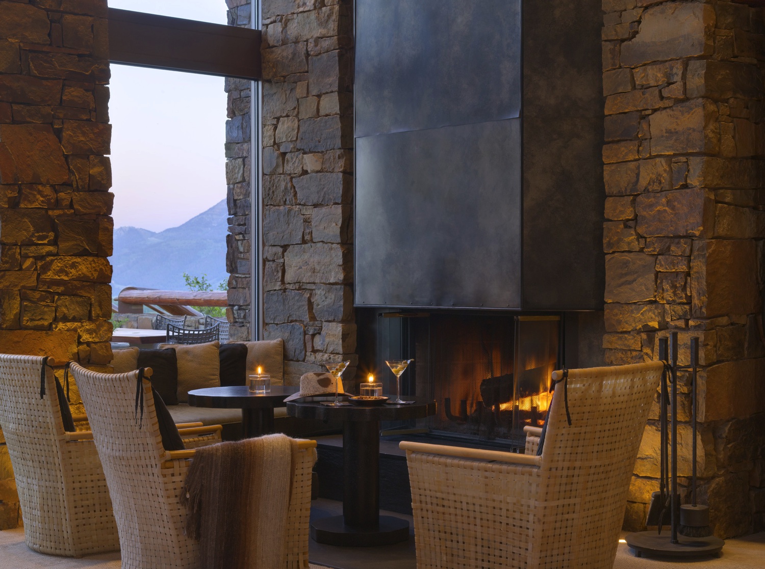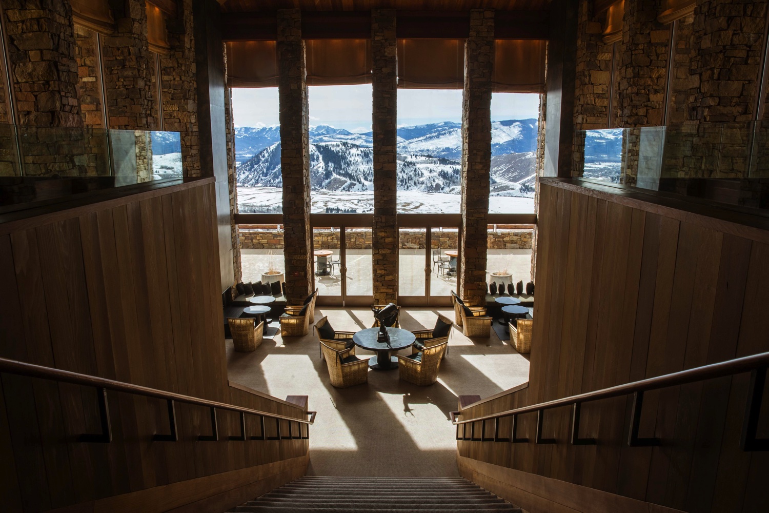 The Lounge – Serviert ganztägig leichte Mahlzeiten im herrlichen Ambiente mit doppelhohen Fenstern, zwei holzbefeuerten Kaminen, weitläufigen Terrassen und Panoramablick auf die Snake River Range und Spring Gulch.
