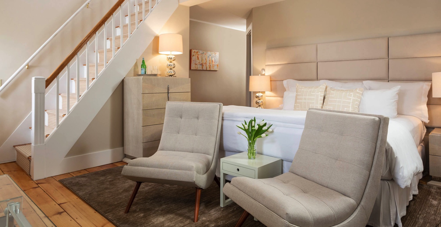 Die Loft Suite ist die größte im Cape Cod Boutiquehotel und verfügt über ein Kingsize-Bett mit Nachttischen, eine gemütliche Sitzecke mit holzbefeuertem Kamin (saisonal), eine Wet Bar mit Kühlschrank, einen Schreibtisch und einen privaten Balkon mit Bistrotisch und Stühlen (saisonal). Eine steile Treppe führt hinauf zu einem Loft mit zwei Einzelbetten.