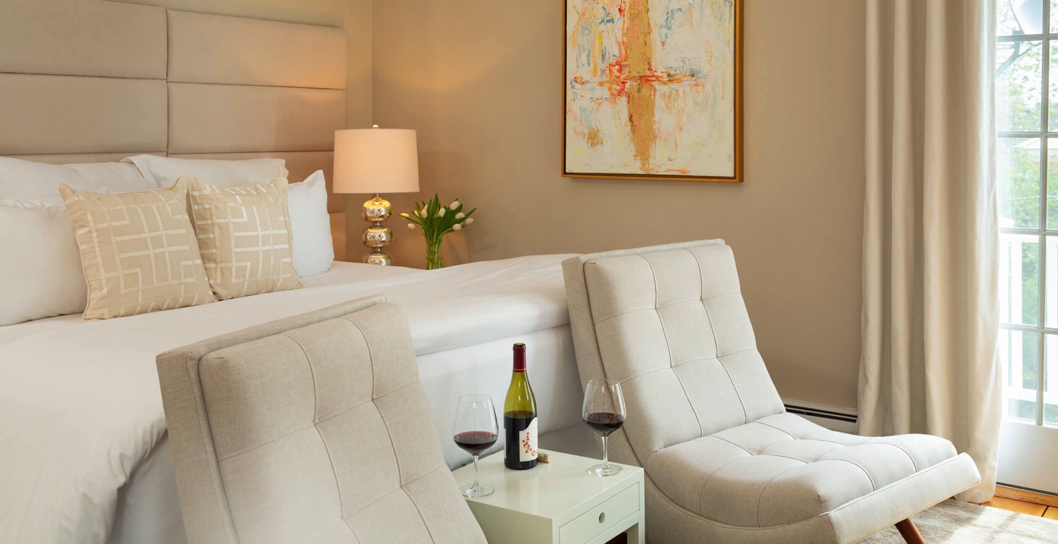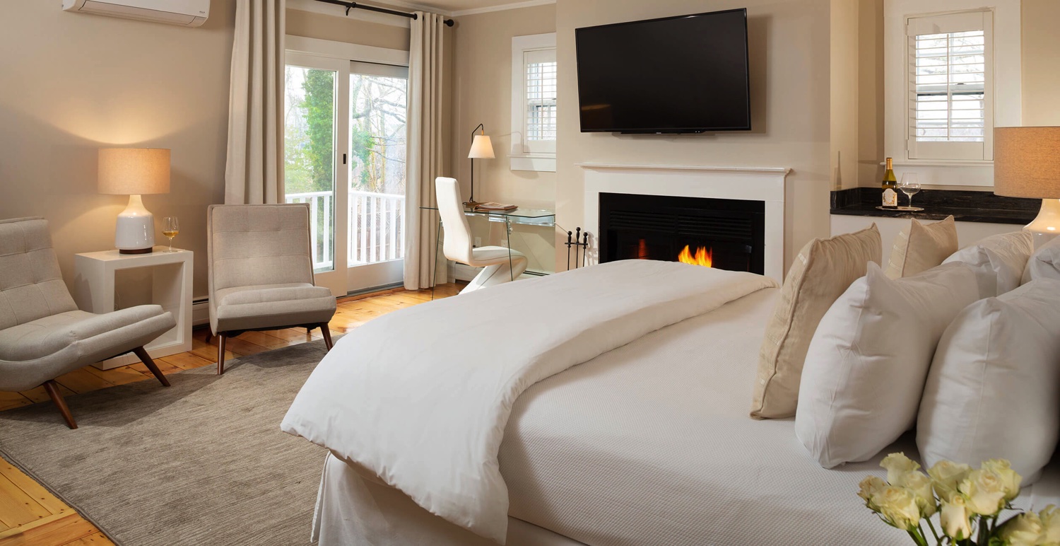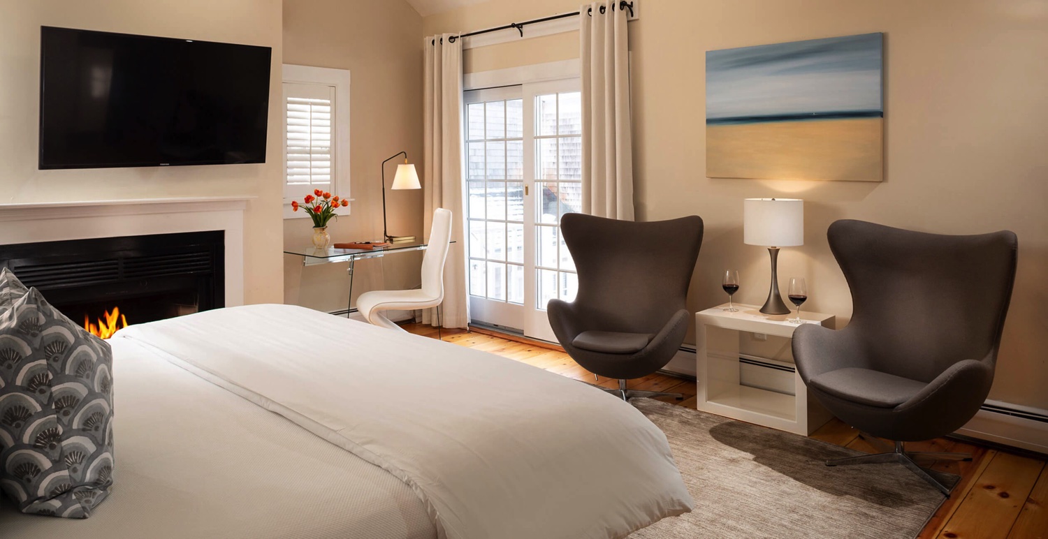 Eines der größten Zimmer des Chatham Inn ist Room 3. Es bietet ein Kingsize-Bett mit Nachttischen, eine gemütliche Sitzecke mit Stühlen und einen Holzofen (saisonal) und eine Wet-Bar mit Kühlschrank sowie einen privaten Balkon mit Bistrotisch und Stühlen (saisonal).
