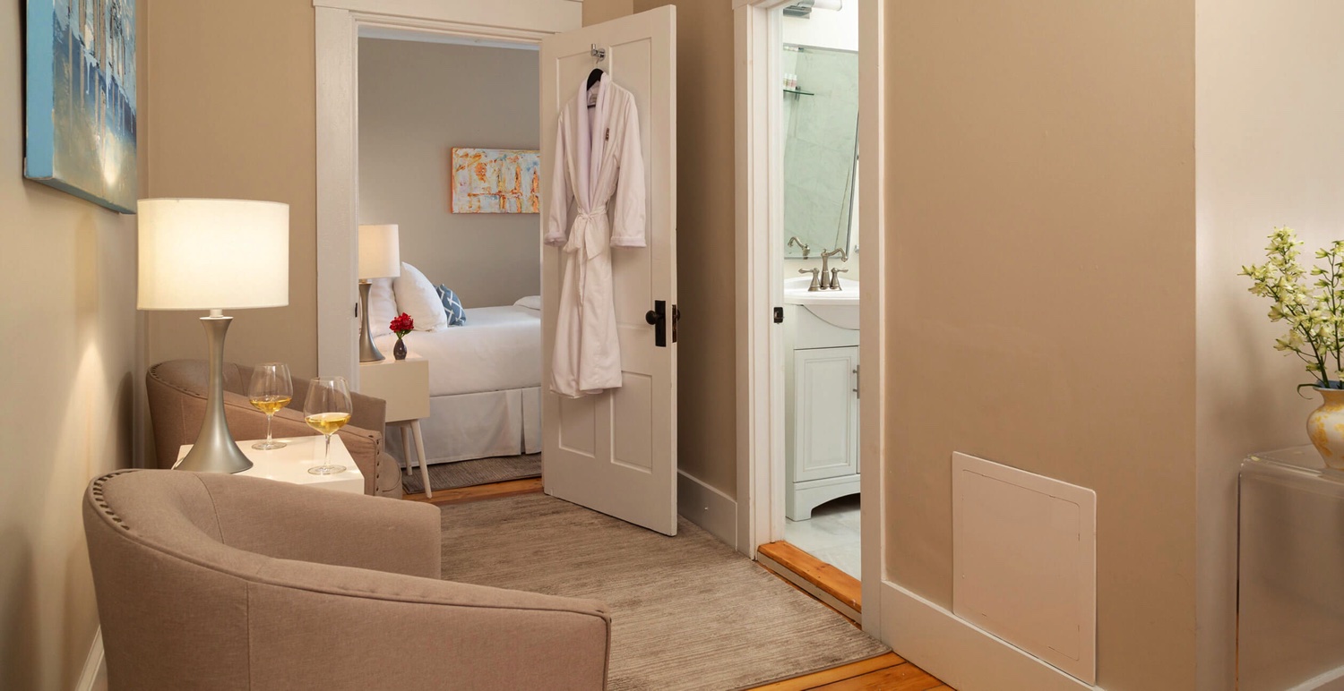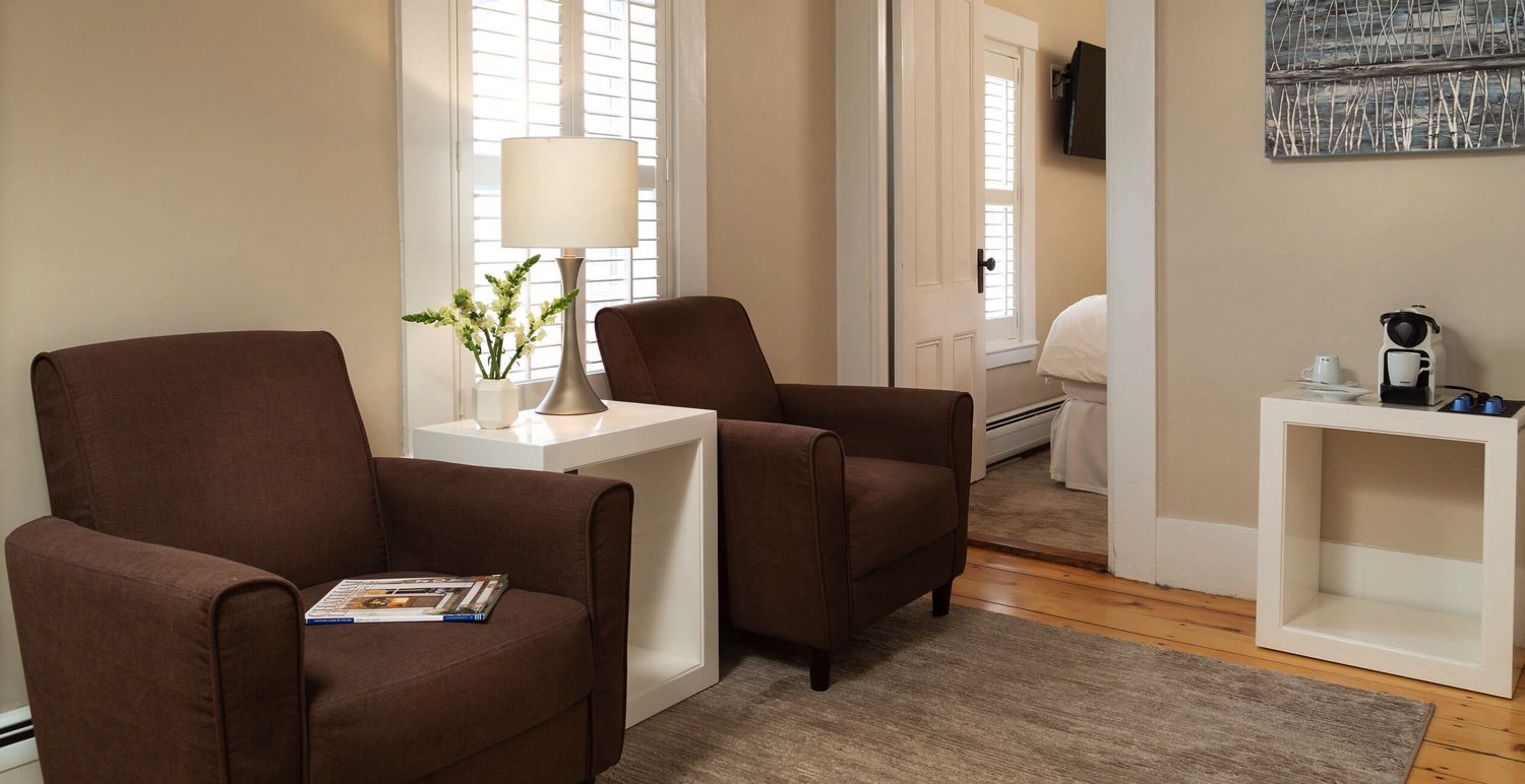 Die Suite 15 befindet sich im zweiten Stock mit Nordlage und Blick auf die malerische Main Street. Auf beiden Seiten des Wohnzimmers befinden sich zwei separate Schlafzimmer.
