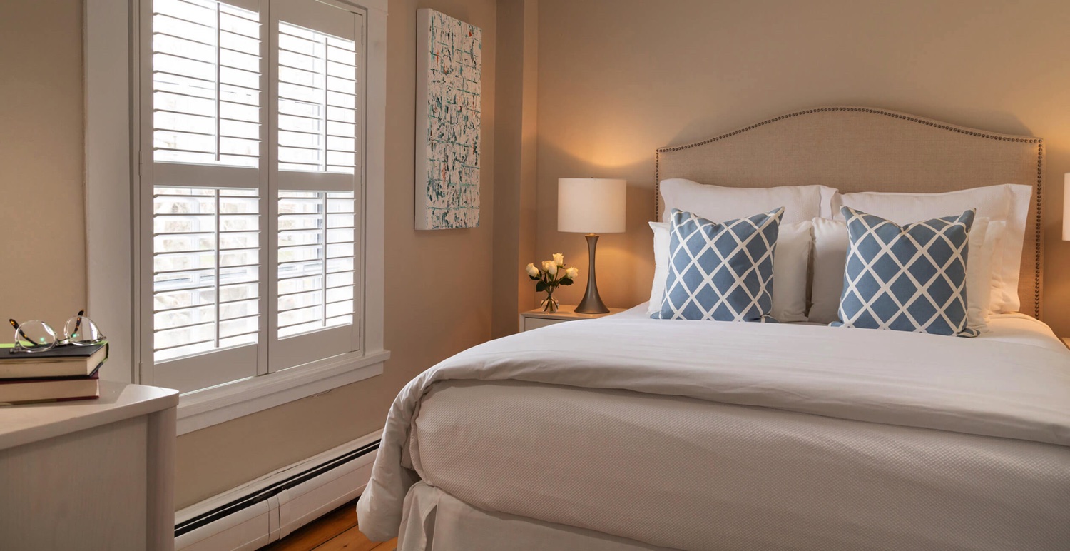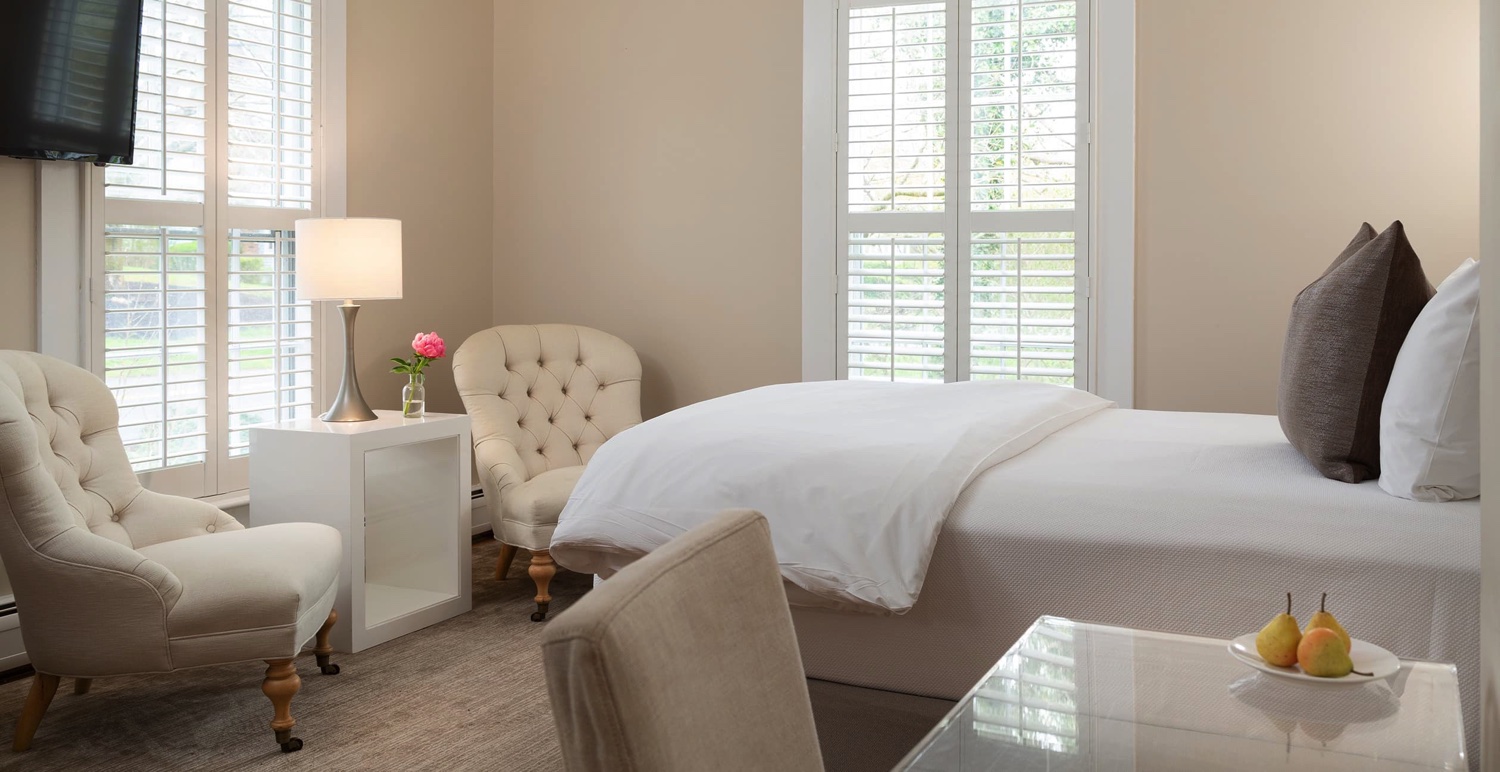 Dieses Eckzimmer befindet sich im ersten Stock und ist nach Nordosten zur malerischen Main Street ausgerichtet. Room 5 hat ein Queensize-Bett, eine kleine Sitzecke und einen Schreibtisch.