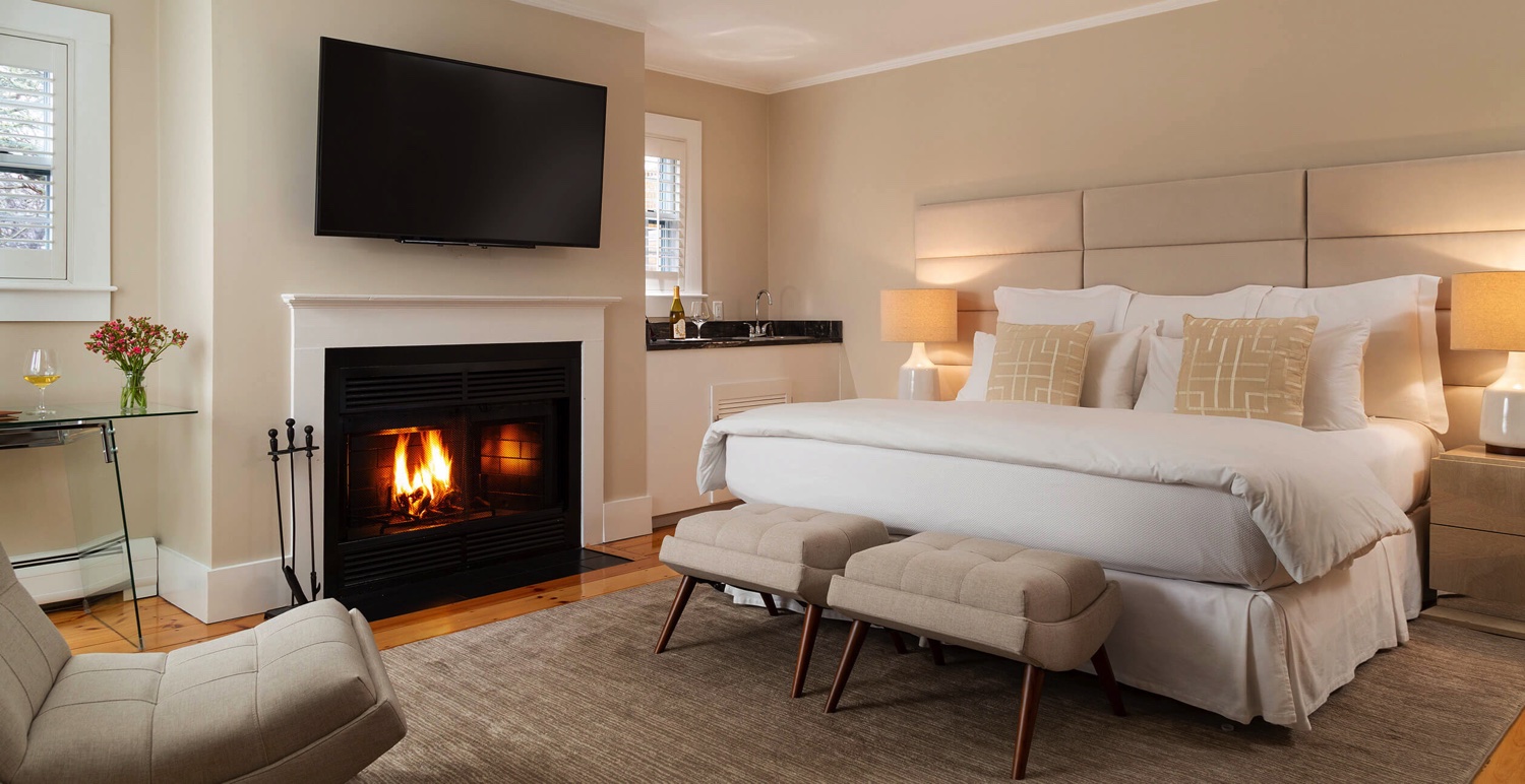 Im ersten Stock gelegen mit Nordausrichtung und direkt an die Lobby grenzend verfügt Room 7 über einen Gaskamin, der sowohl vom großen Marmorbad als auch vom Schlafzimmer mit Queen-Bett zu sehen ist.