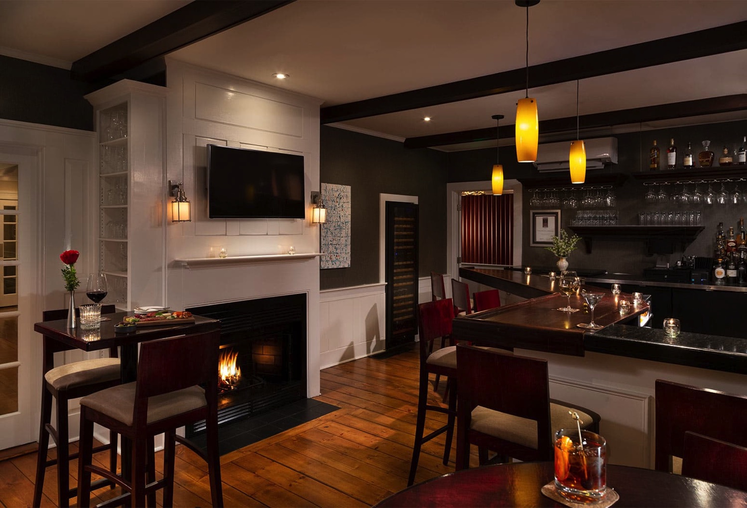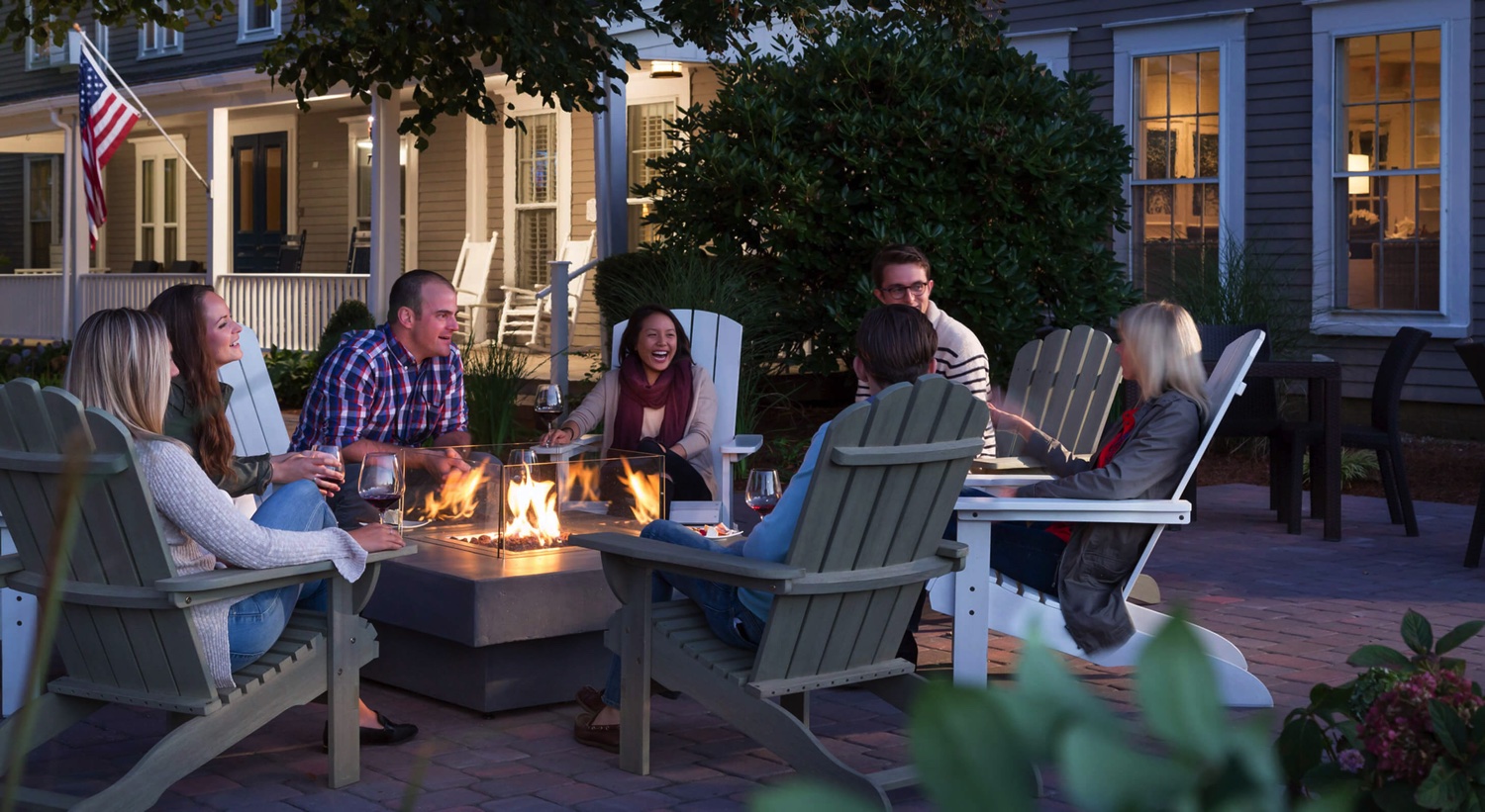 The Terrace – In den Sommermonaten gibt es Drinks und Snacks im Freien auf der Terrasse mit Feuerstelle, von der man einen Blick auf die malerische Main Street von Chatham hat.