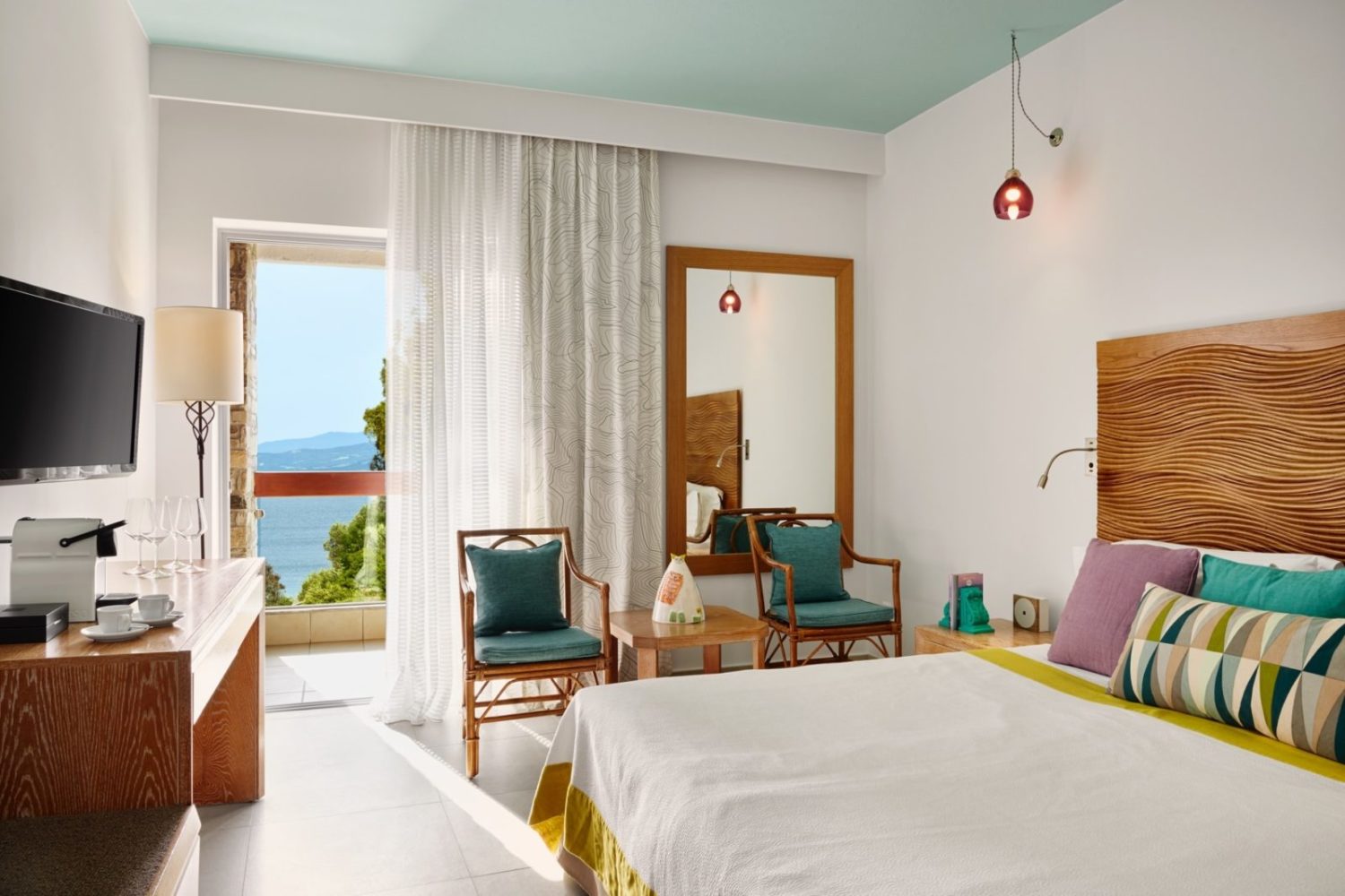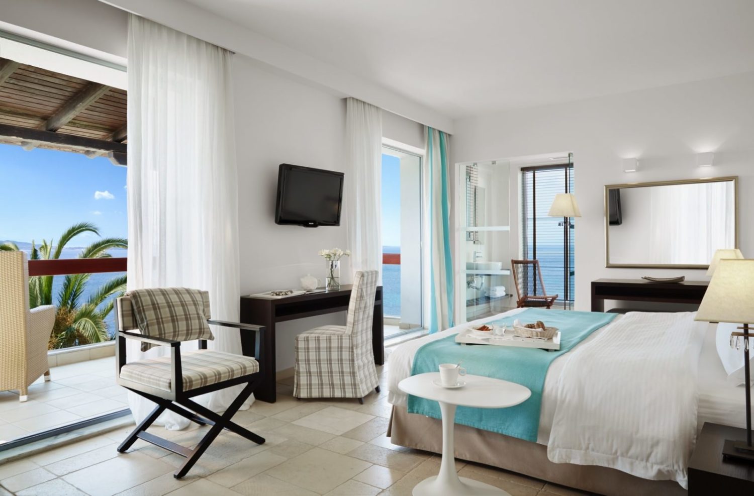 Die 157 Zimmer, Bungalows und Suiten des Eagles Palace sind elegant im mediterranen Stil eingerichtet. Sie bieten herrliche Ausblicke auf das Dorf Ouranoupolis, die Gartenanlage oder die smaragdgrün leuchtende Ägäis. Die Standardausstattung umfasst einen komfortablen Sitzbereich, Klimaanlage, Sat-TV, Telefon, kostenfreies WLAN, Highspeed-Internetzugang (gegen Gebühr), Safe, Minibar und ein großzügiges Bad mit Föhn, Strandhandtüchern, Slippern und Bademantel sowie Balkon oder Terrasse. Zur Auswahl stehen folgende Kategorien: Superior Twin Room (ca. 25 qm) im Hauptgebäude mit Standardausstattung und wahlweise Garten- oder Meerblick, Family Suite (ca. 40 qm) mit zusätzlich abtrennbarem Wohnbereich inklusive Bettsofa, Junior Suite (40 – 45 qm) im Hauptgebäude mit Sitzecke wahlweise Meerblick oder direkter Strandlage mit oder ohne Jacuzzi, One Bedroom Suite (ca. 55 qm) mit großem Wohnzimmerbereich und Marmorbadewanne, Two Bedroom Suite Sea View (ca. 65 qm) mit zwei Schlafzimmern, separatem Wohnzimmer und großem Balkon mit Essbereich und Meerblick, Suite with Private Pool (80 – 100 qm) mit Master Bedroom, getrenntem Wohnzimmer, zwei Marmor-Bädern und privatem Pool, Grand Suite with Private Pool (150 – 170 qm) mit zwei Schlafzimmern, zwei Bädern, separatem Wohnzimmer und privatem Pool (teils mit direktem Strandzugang), Bungalow (ca. 50 qm) mit wahlweise Meerblick, Strandlage und privatem Pool, Two Bedroom Bungalow (60 – 70 qm) mit zwei Schlafzimmern sowie großzügiger Terrasse mit privatem Pool und Presidential Bungalow Sea Front with Private Pool mit Bar, begehbarem Kleiderschrank, großem Marmorbad, großer Terrasse mit privatem Pool und direktem Strandzugang (ca. 180 qm).