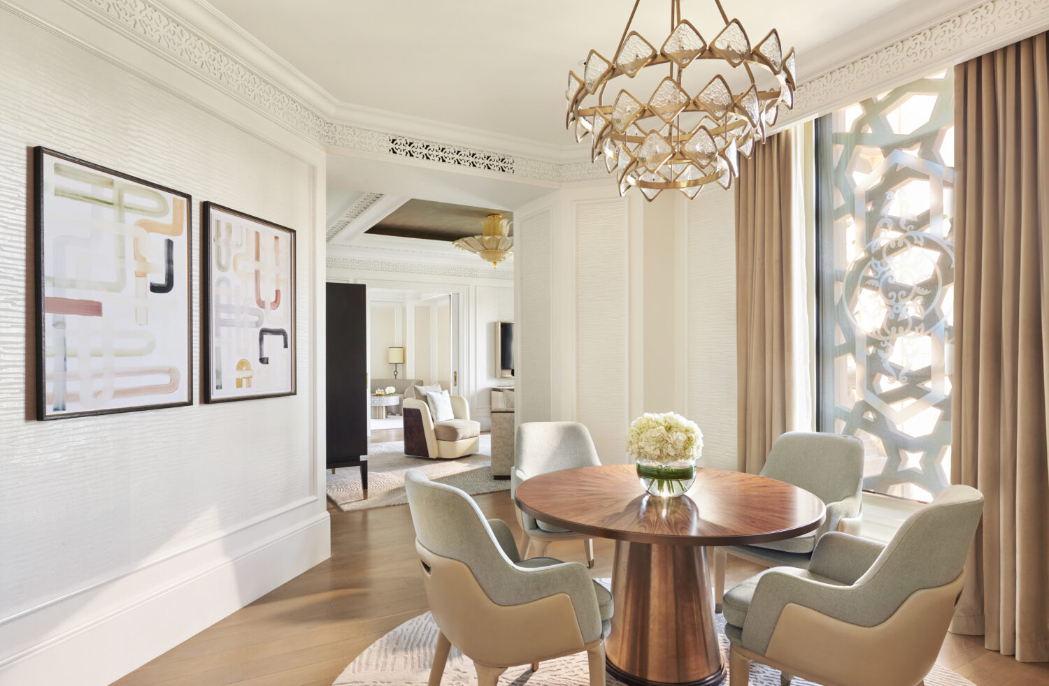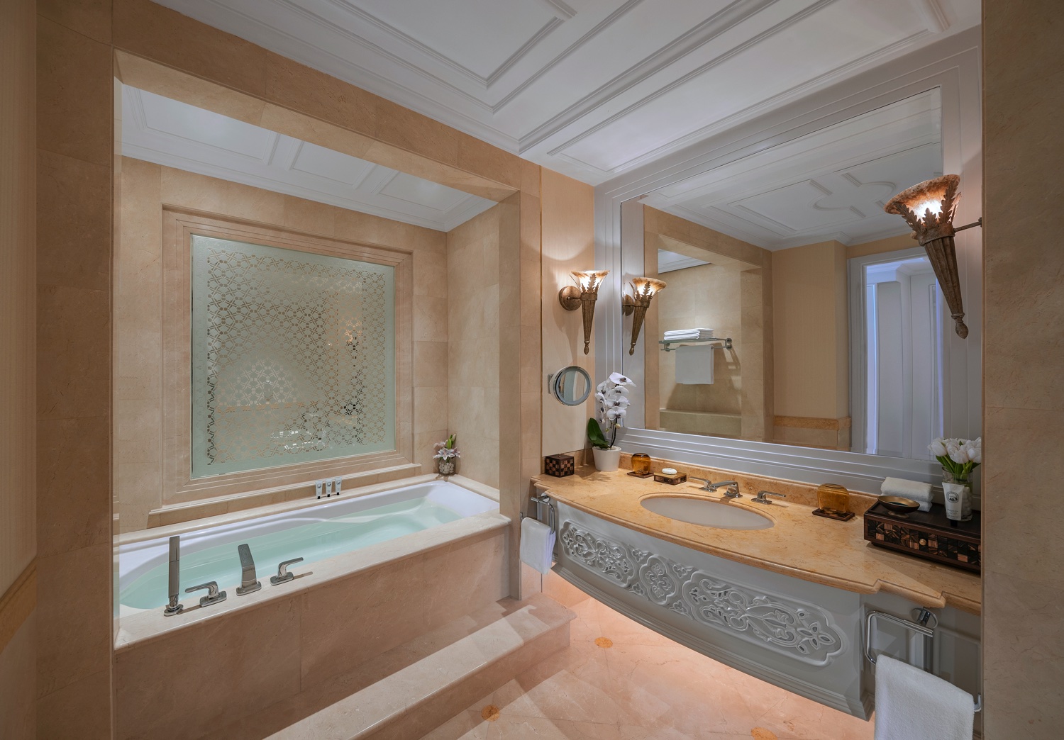 Mit drei Schlafzimmern, Wohnzimmer, Sitzbereich (Majlis), Küche, luxuriösen King Size-Betten, privater Terrasse und Badezimmer mit übergroßer Badewanne und Whirlpool. 180-Grad-Blick auf den palmengesäumten Golf und Zugang zur exklusiven EP Club-Lounge.. Die Three Bedroom Palace Suite ist noch im ursprünglichen Design gehalten.