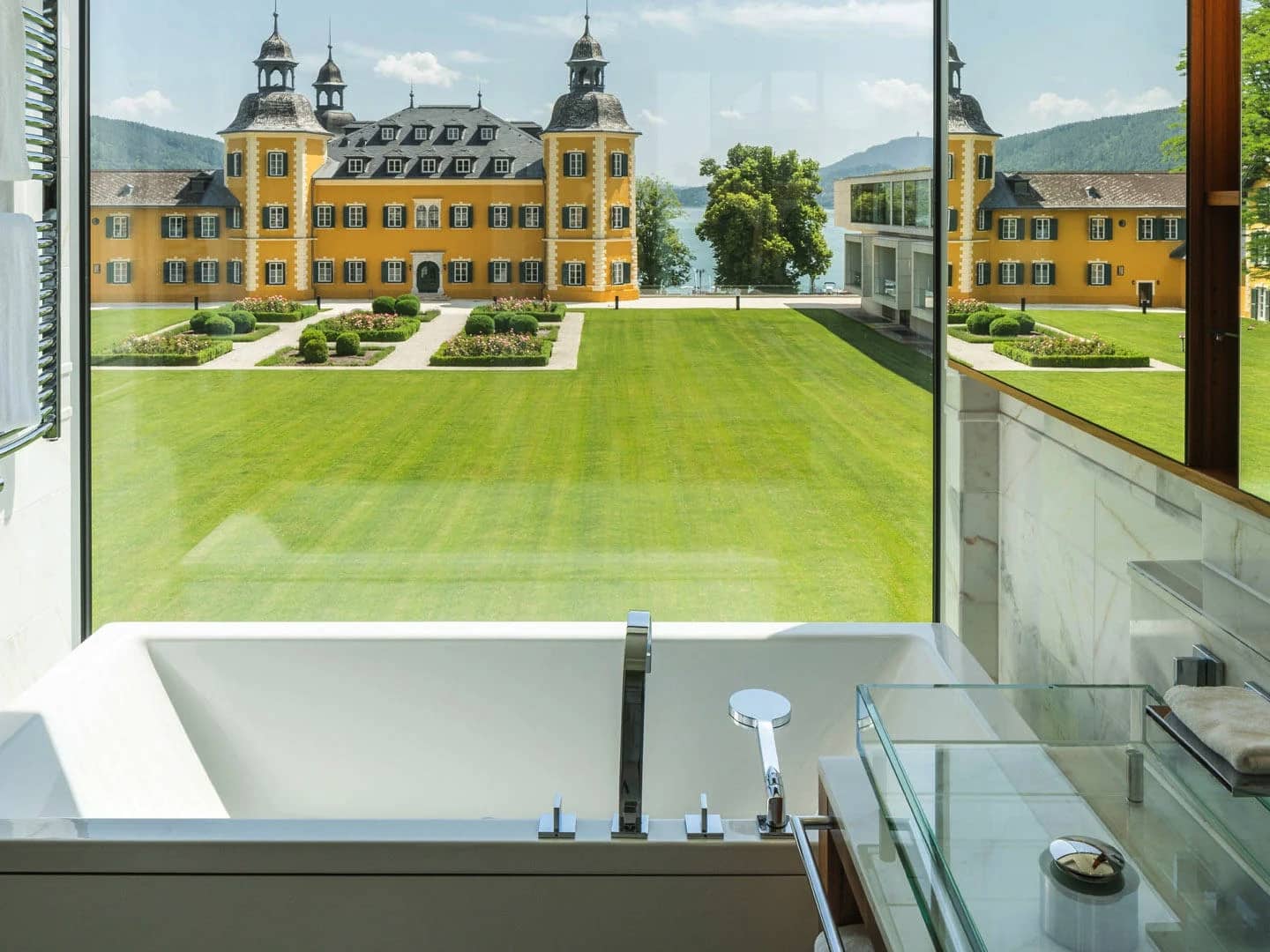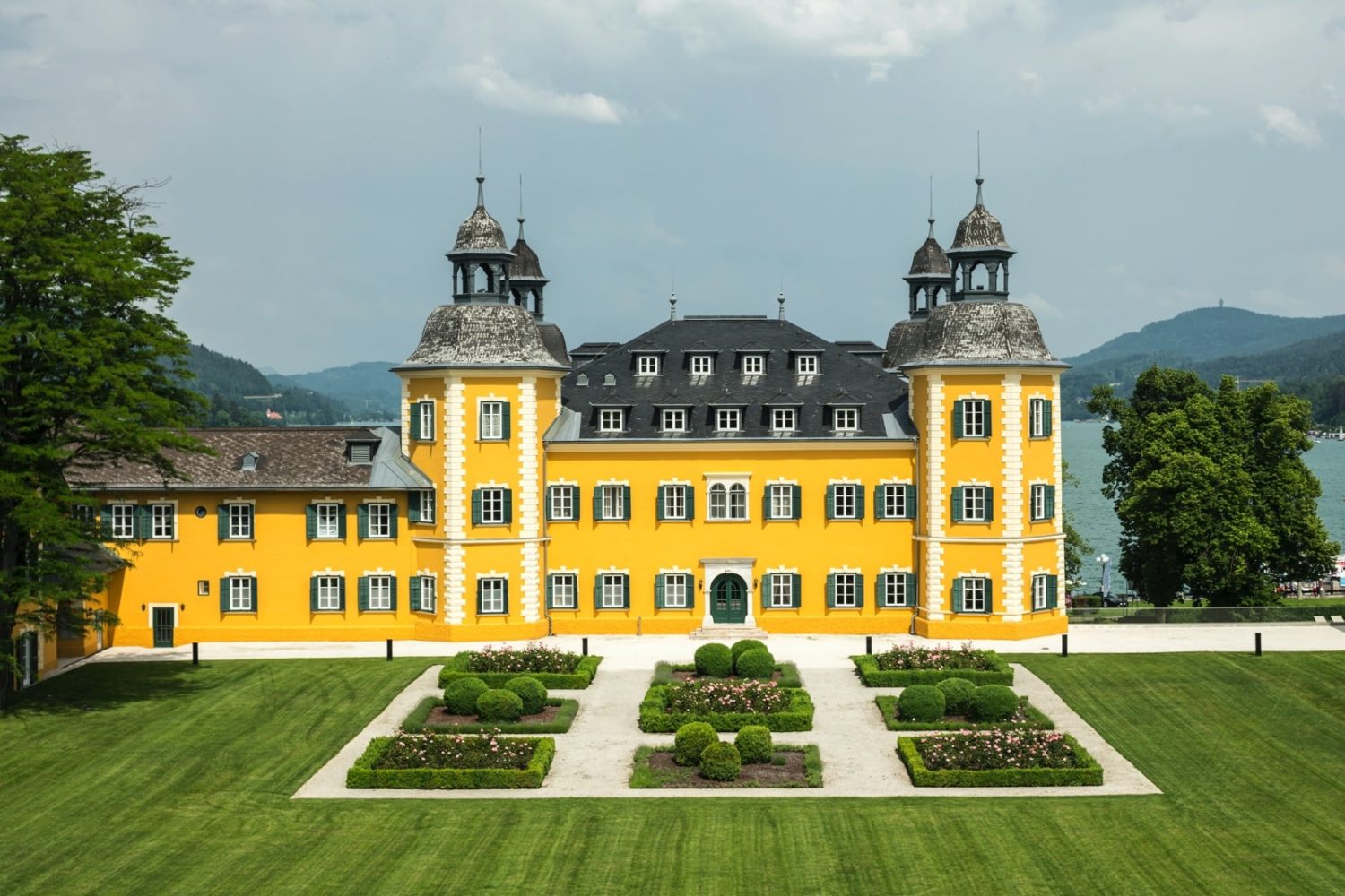 Im historischen Schloss oder im modernen Gebäude mit Blick auf den Rosengarten, den Schlosspark, das Dorf Velden oder den Wörthersee gelegen und teils mit Balkon.