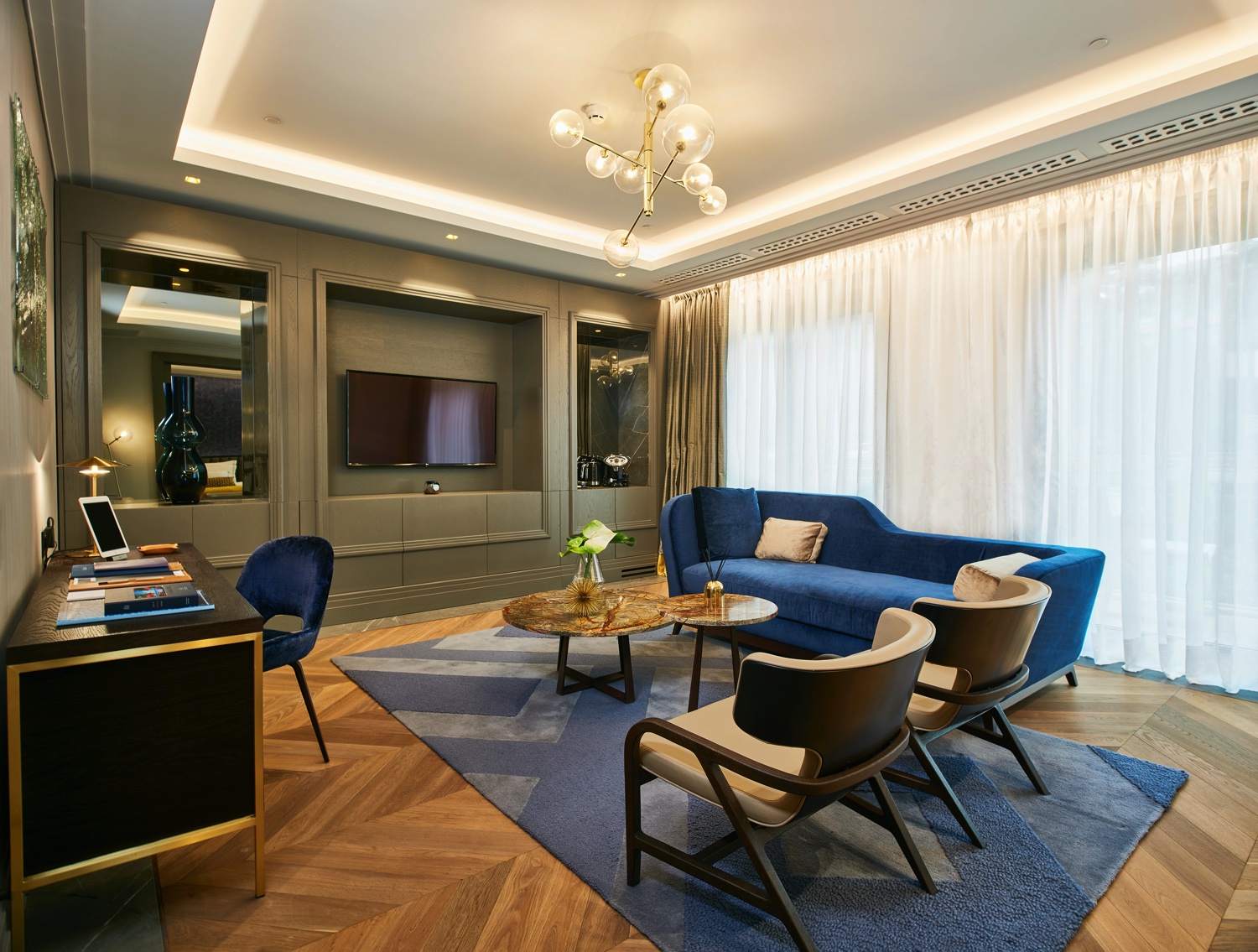 Ultra-luxuriöse Suite mit separater Lounge inkl. Essbereich, und Kamin, Küche, begehbarem Kleiderschrank, extragroßem Bad sowie einer XXL-Terrasse mit Lounge und Jacuzzi