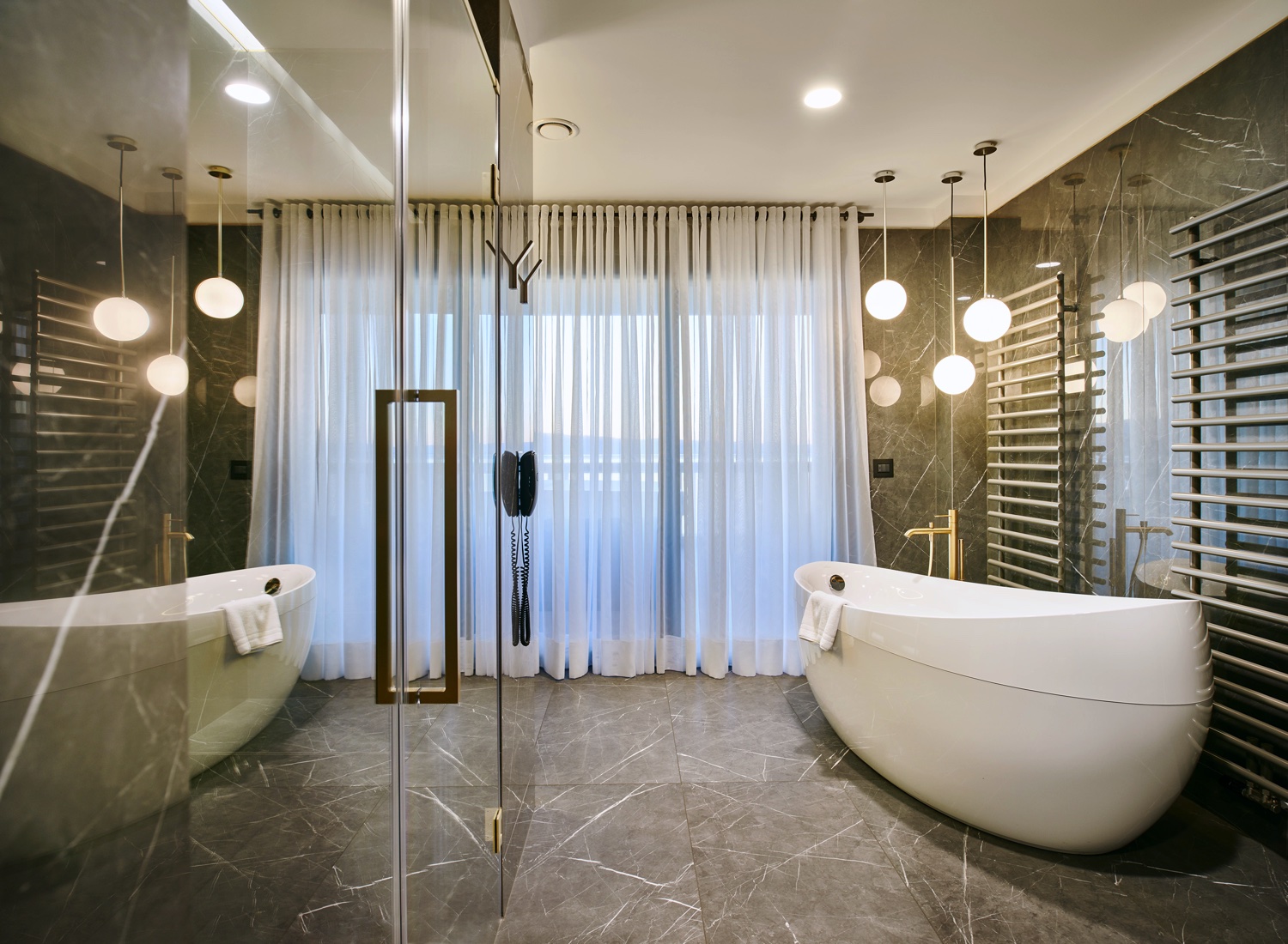 Einzimmer-Suite im obersten Stockwerk mit großem Badezimmer inklusive Doppelwaschbecken, Walk-in Regendusche und Bidet sowie weitläufiger Eckterrasse mit Meerblick