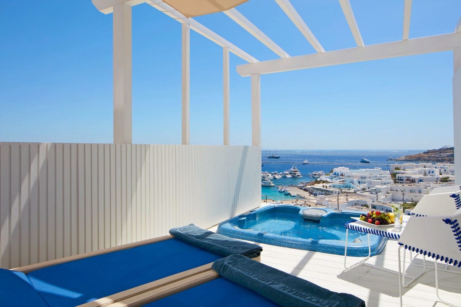 Das Myconian Ambassador verfügt über einen wunderschönen Pool mit Meerblick und Sonnenterrasse.
