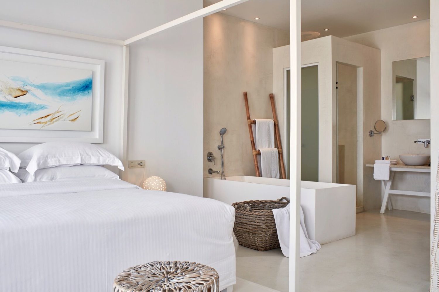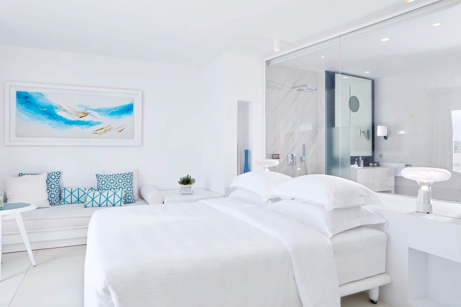 Folgende Kategorien stehen zur Auswahl: Sea Breeze (28 qm) mit individuellem Lichtdesign und Balkon mit seitlichem Meerblick, True Blue (28 qm) wie Sea Breeze nur mit Meerblick – wahlweise auch mit Terrasse inkl. Jacuzzi oder Pool buchbar, White Bliss (35 qm) wie True Blue nur größer Meerblick – wahlweise auch mit Terrasse inkl. Jacuzzi oder Pool buchbar, Horizon Retreat (35 qm) im obersten Stockwerk mit Traum-Panorama und 20 qm-Veranda sowie 40 qm-Marmorpool und Schlafsofa im Wohnbereich, Grand Blue (35 qm) wie Horizon Retreat, Thalassa Suite (45 qm) mit Veranda und Meerblick – wahlweise mit Jacuzzi, geteiltem oder privaten Pool buchbar, Azure Suite (45 qm) mit großer Terrasse inklusive Jacuzzi und Meerblick, Sitzecke mit Schlafsofa und Bad mit separater Dusche und Badewanne, True White Suite (45 qm) mit großer Terrasse inklusive Jacuzzi und Meerblick sowie Bad mit separater Dusche und Badewanne, Passion Suite (45 qm) für Romantiker mit offenem Wohnzimmer, malerischer Terrasse mit Whirlpool und Meerblick sowie einem Bad mit Dusche und Wohnbereich und The Villa mit wahlweise 2 – 8 Ensuite-Schlafzimmern, Außenbereich mit Garten, Terrasse mit Infinity Pool und Jacuzzi, überdachtem Patio sowie einer zweiten Veranda im ersten Stock, privater Bar, Weinkeller. Private Spa-Treatments, Yoga und Pilates-Kurse und In Villa Dining möglich.