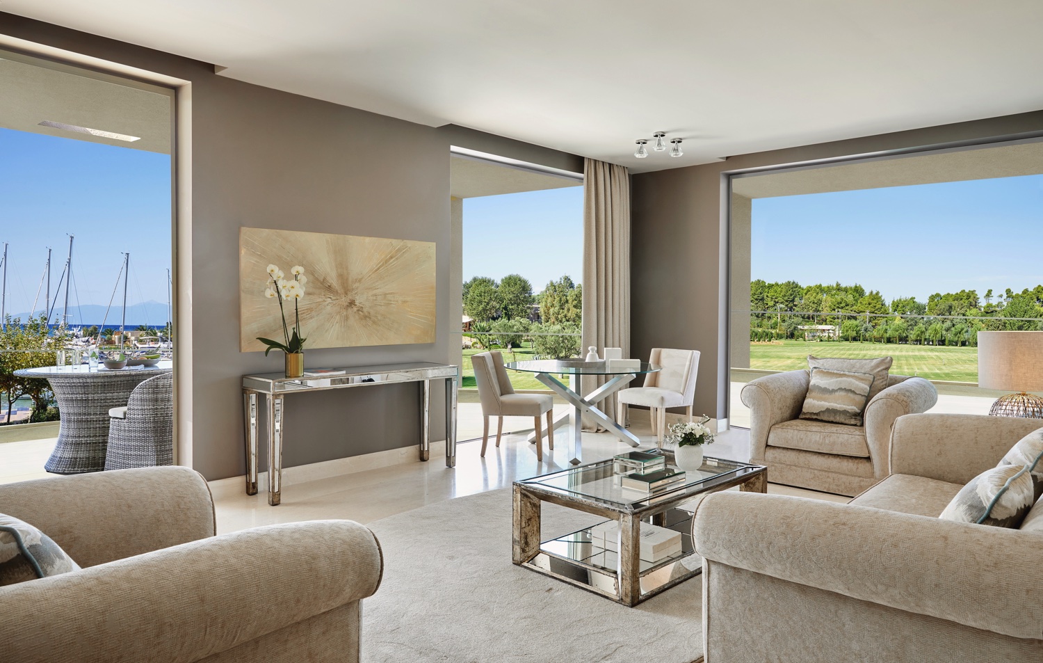 Die 103 Suiten sind in hellem, modernem Design eingerichtet und wirken dank viel Holz, Naturstein sowie edlen Stoffen elegant und dennoch gemütlich. Alle Unterkünfte verfügen über eine möblierte Terrasse oder Balkon mit spektakulärem Blick über die Pools und die Marina sowie Telefon, Satelliten-TV, DVD-/CD-Player, Minibar, Safe und Klimaanlage. Die großen Badezimmer sind standardmäßig mit Regendusche, Badewanne und Föhn ausgestattet. Gäste haben die Wahl zwischen folgenden Kategorien: Juniorsuite (35 qm) an der Marina, mit Kochecke und möbliertem Balkon, Sparpreis-2-Raum-Suite (55 qm) wie 2-Raum-Suite, jedoch geringe Verfügbarkeit und „Run of the House“, 2-Raum-Suite (55 qm) mit separatem WC und möbliertem Balkon oder Terrasse, 2-Raum-Suite/Poolblick (55 qm), 2-Raum-Deluxe-Suite (60 qm) mit separatem WC und möbliertem Balkon oder Terrasse, Familienapartment (90 qm) mit 2 Schlafräumen, separatem Wohnraum und 2 Bädern.