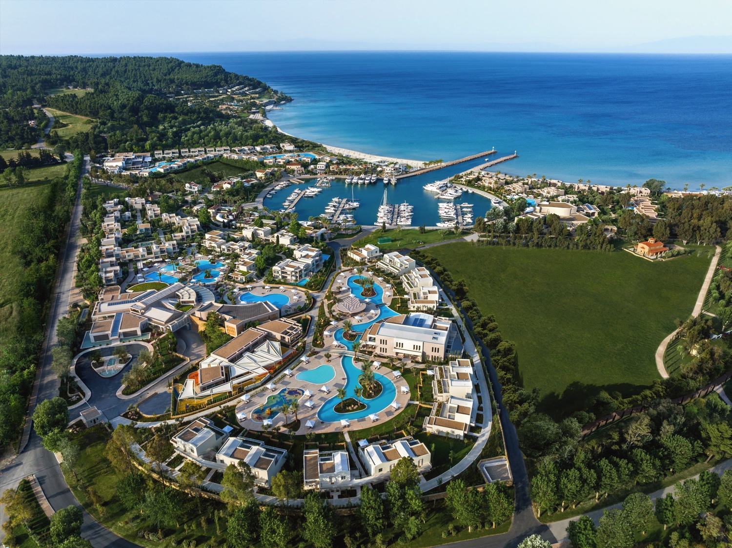 An der Westküste von Kassandra, einer der drei Halbinseln von Chalkidiki, erstreckt sich auf 400 ha ein familienfreundliches Urlaubsparadies der Superlative. Das luxuriöse En-Suite-Hotel liegt an einem 7 km langen, feinsandigen Strand inmitten eines üppig bewaldeten Naturschutzgebietes. Auf dem selben Gelände befinden sich mit dem Sani Beach und dem Sani Club zwei weitere Hotels, deren Einrichtungen teilweise mitgenutzt werden können. Krönung der traumhaften Lagunenlage ist die Nähe zur Sani Marina, die der Szenerie mit ihrem majestätischen Yachthafen einen mondänen Flair verleiht.