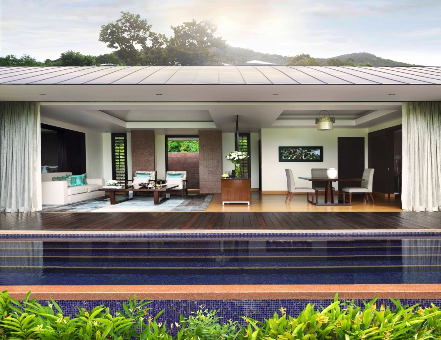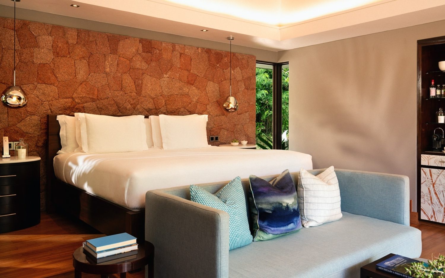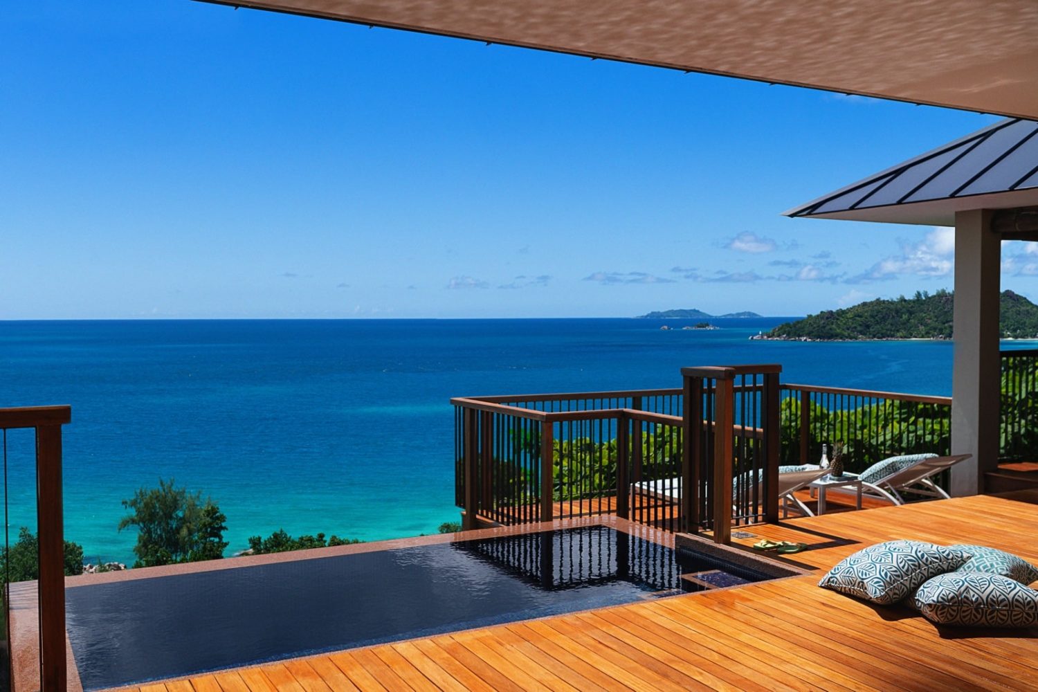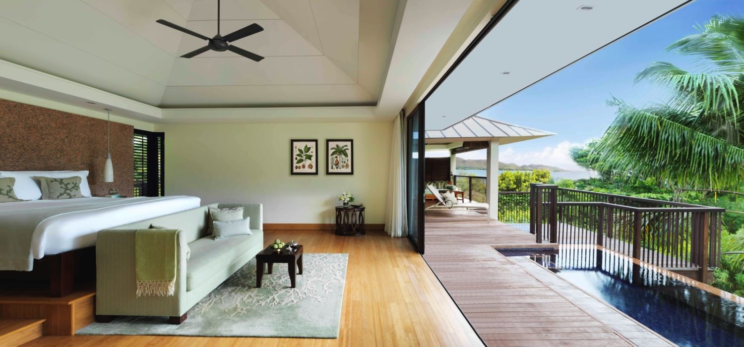 Zur Auswahl stehen die Hillside Pool Villen (ca. 125 qm) mit Kingsize-Bett, die Oceanview Pool Villen (ca. 125 qm) mit Blick auf die Insel Curieuse und das Meer, die Panoramic Pool Villen (ca. 125 qm) in exponierter Lage am höchsten Punkt des Resorts mit Panoramablick auf den Indischen Ozean und die umliegenden Inseln, 1-Bedroom Pool Villen (ca. 200 qm) mit großem separatem Wohnzimmer und die 2-Bedroom Pool Villen (ca. 275 qm), eine davon in unmittelbarer Strandnähe mit zwei Schlafzimmern. Umgeben von tropischer Vegetation bietet diese Villa größtmögliche Privatsphäre mit Meerblick.