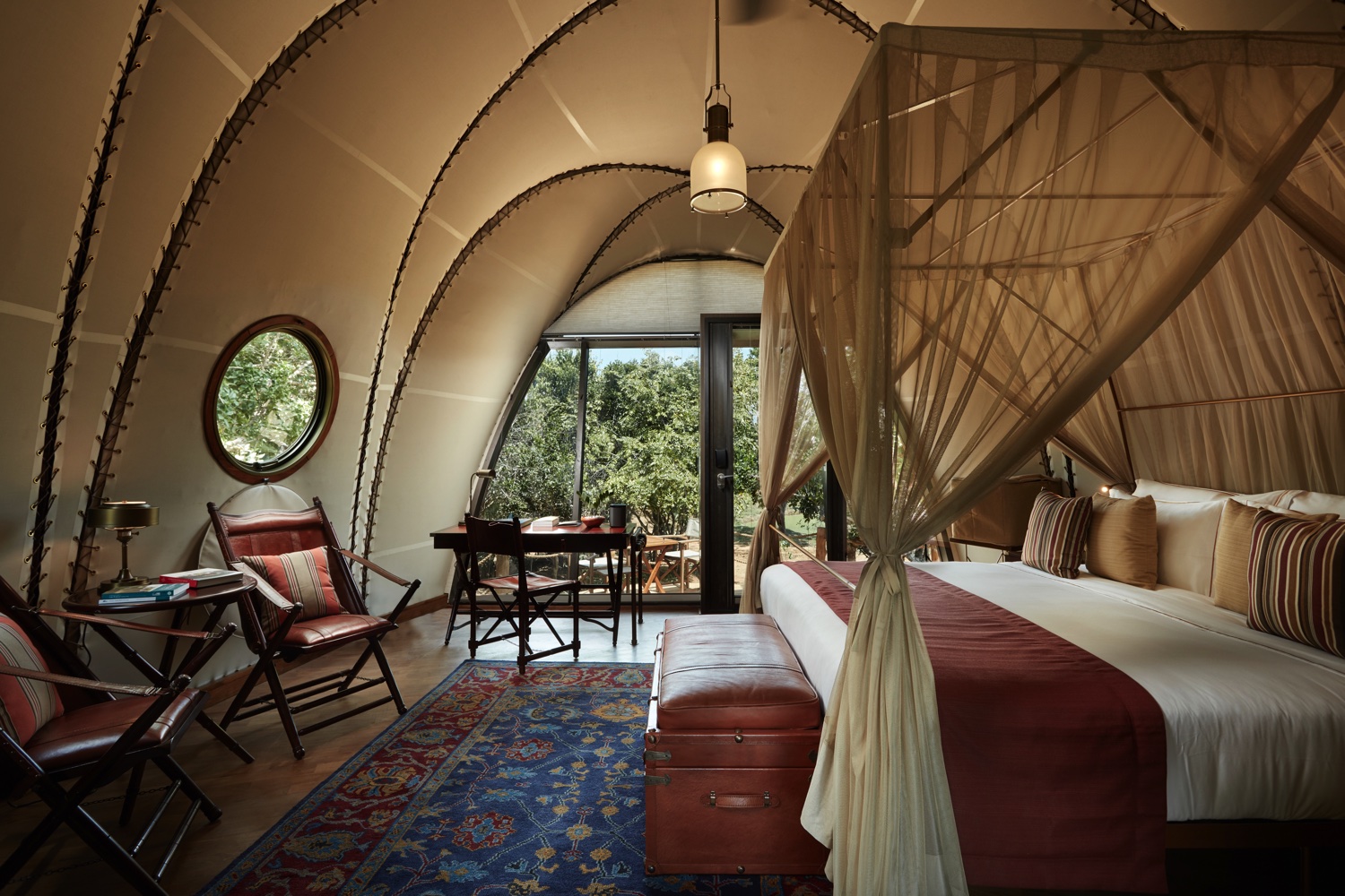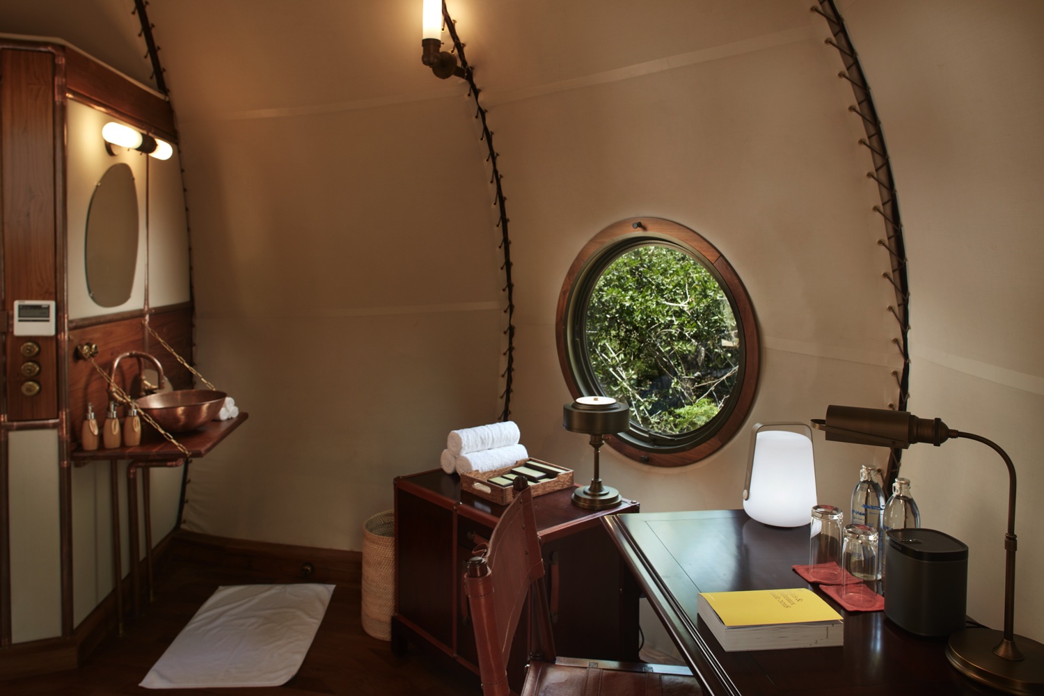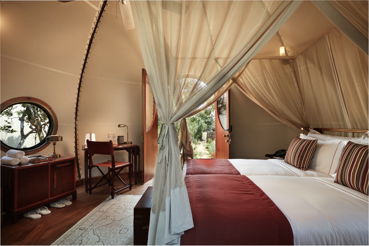 Die Innenräume der insgesamt 28 Cocoons vereinen Expeditionsschick mit zeitgenössischem Design. Sie sind mit freistehenden handgefertigten Kupferbadewannen, Himmelbetten, Teakholzböden und Segeltuchwänden ausgestattet. Sie alle verfügen über kostenloses Wi-Fi, individuell regulierbare Aircondition, Liegestühle, Tisch und Stühle im Freien, geschlossenes WC und Dusche, Zustellbett, Schreibtisch, Minibar mit Espressomaschine, Teeauswahl, Sonos-Lautsprecher mit Musikbibliothek, Elsafe-Schließfach und digitales Telefon.