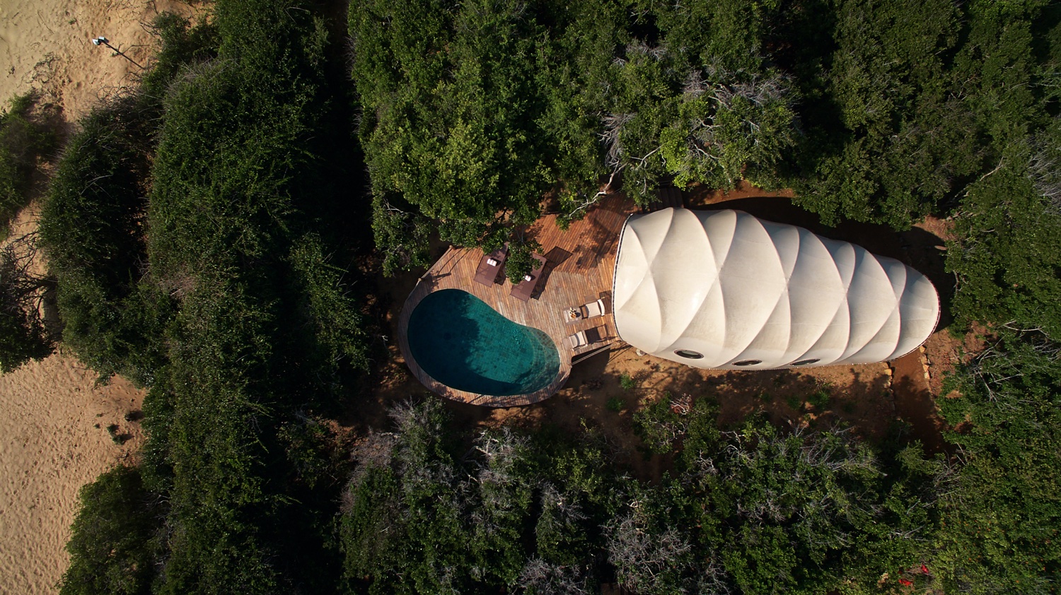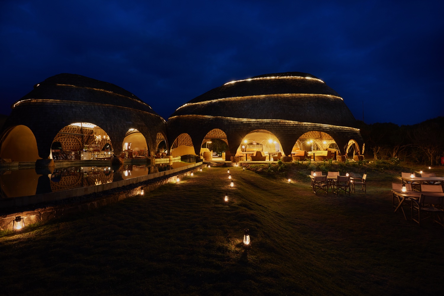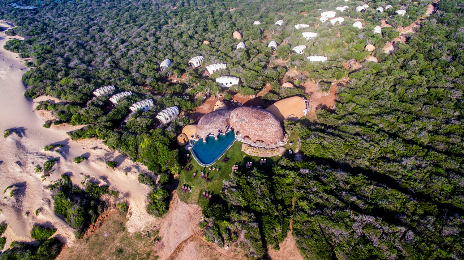 Die sechzehn Cocoons sind in Gruppen von jeweils vier Stück um Wasserlöcher herum angeordnet und bieten dank ihrer Fensterfronten oder von den Aussichtsplattformen einen Blick auf Vögel und Amphibien. Ausgestattet mit Kingsize-Betten, geräumigem Badezimmer mit Kupferbadewanne.