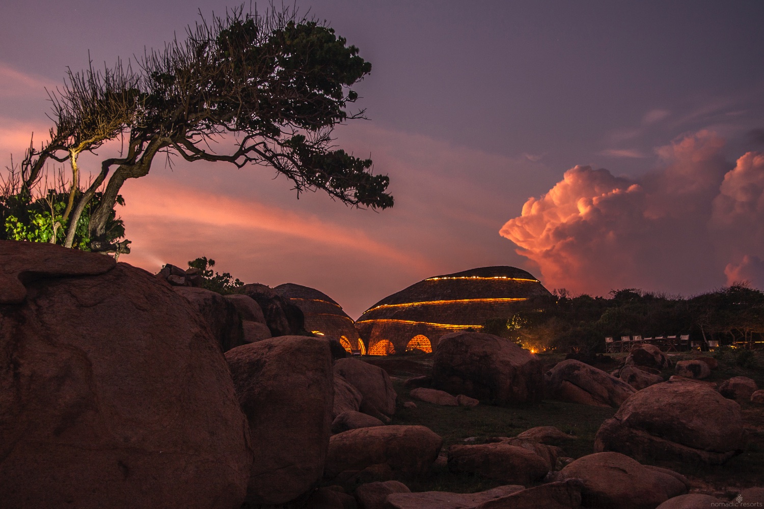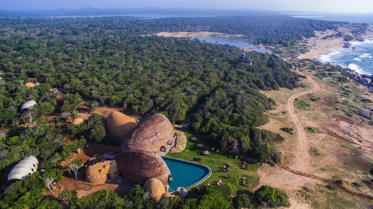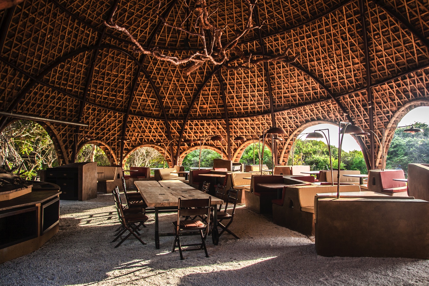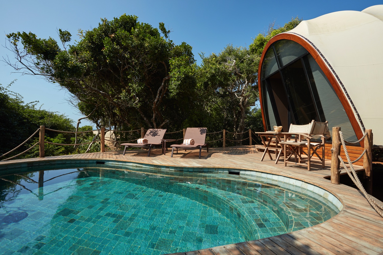 Die sechzehn Cocoons sind in Gruppen von jeweils vier Stück um Wasserlöcher herum angeordnet und bieten dank ihrer Fensterfronten oder von den Aussichtsplattformen einen Blick auf Vögel und Amphibien. Ausgestattet mit Kingsize-Betten, geräumigem Badezimmer mit Kupferbadewanne.