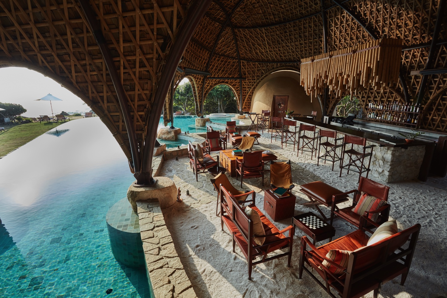 Die vier abgelegenen Pool-Cocoons mit Blick auf den Strand bieten private Tauchbecken und haben hohe Gewölbedecken und große Fensterfronten. Sie verfügen über ein Kingsize-Himmelbett und ein geräumiges Badezimmer mit einer Kupferbadewanne.