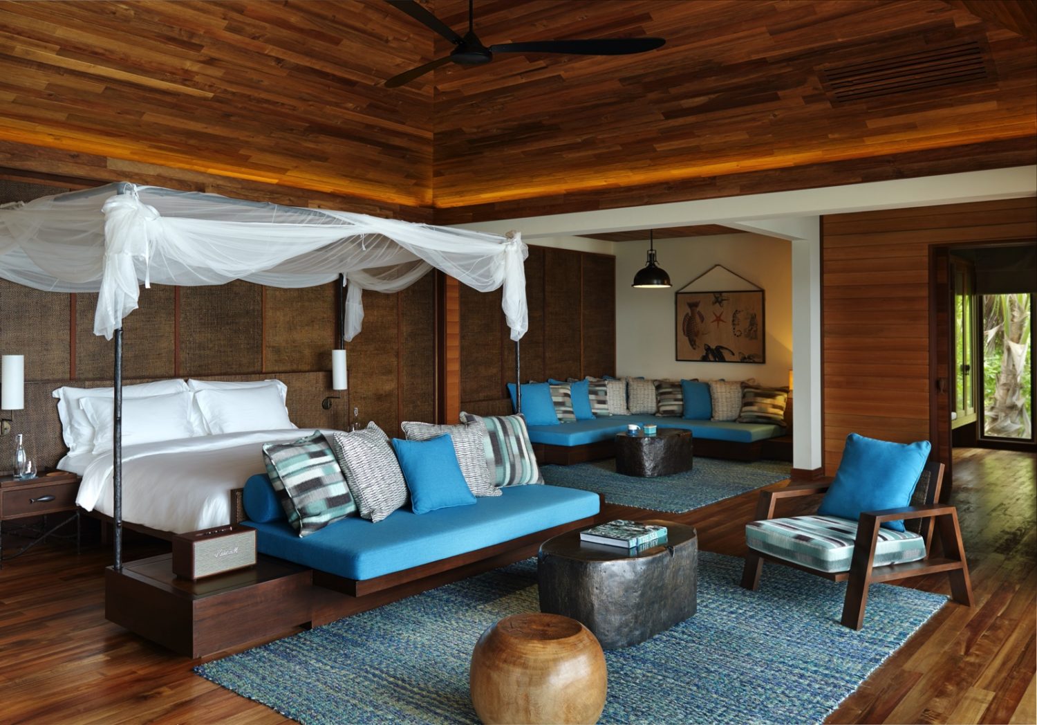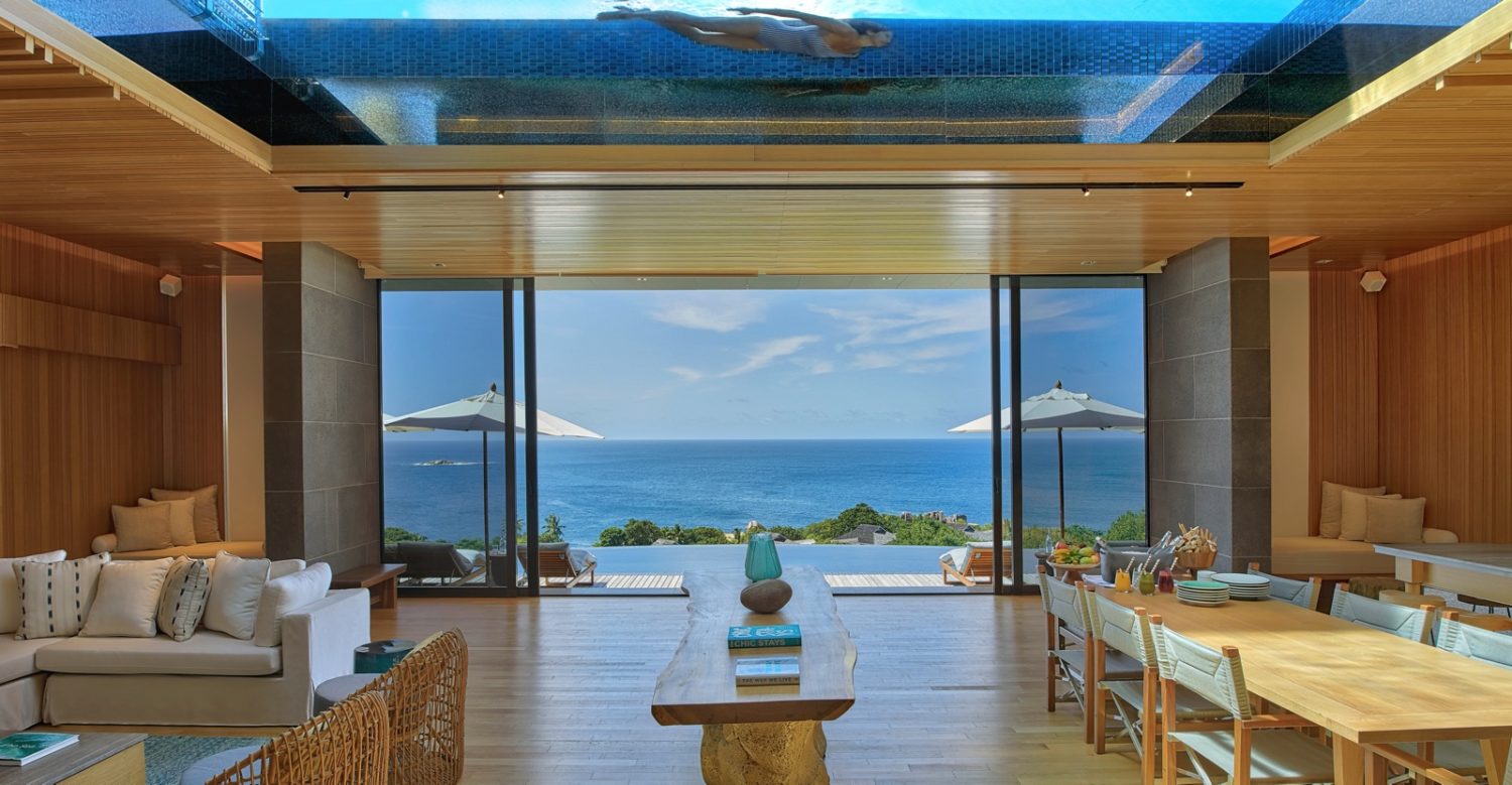 Inmitten tropischer Vegetation erhöht auf Westseite des Resort gelegene geräumige Residenz mit 300° Grad Ausblick auf das Meer und die umliegenden Inseln. Die Residenz hat zwei Stockwerke, wobei die obere Etage dem Master-Schlafzimmer mit Ensuite-Bad sowie 23 Quadratmeter großen Swimmingpool mit Plexiglasboden und die untere Etage den beiden anderen Schlafzimmer nebst Ensuite Bad, Wohnzimmer und Gourmet-Küche vorbehalten ist.