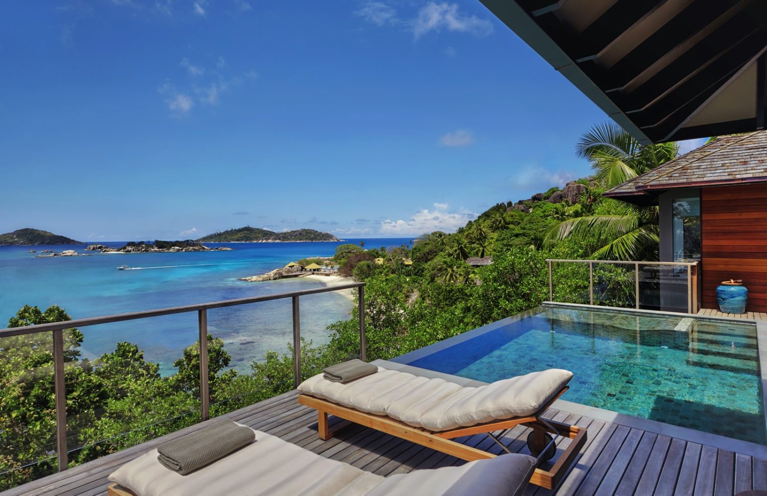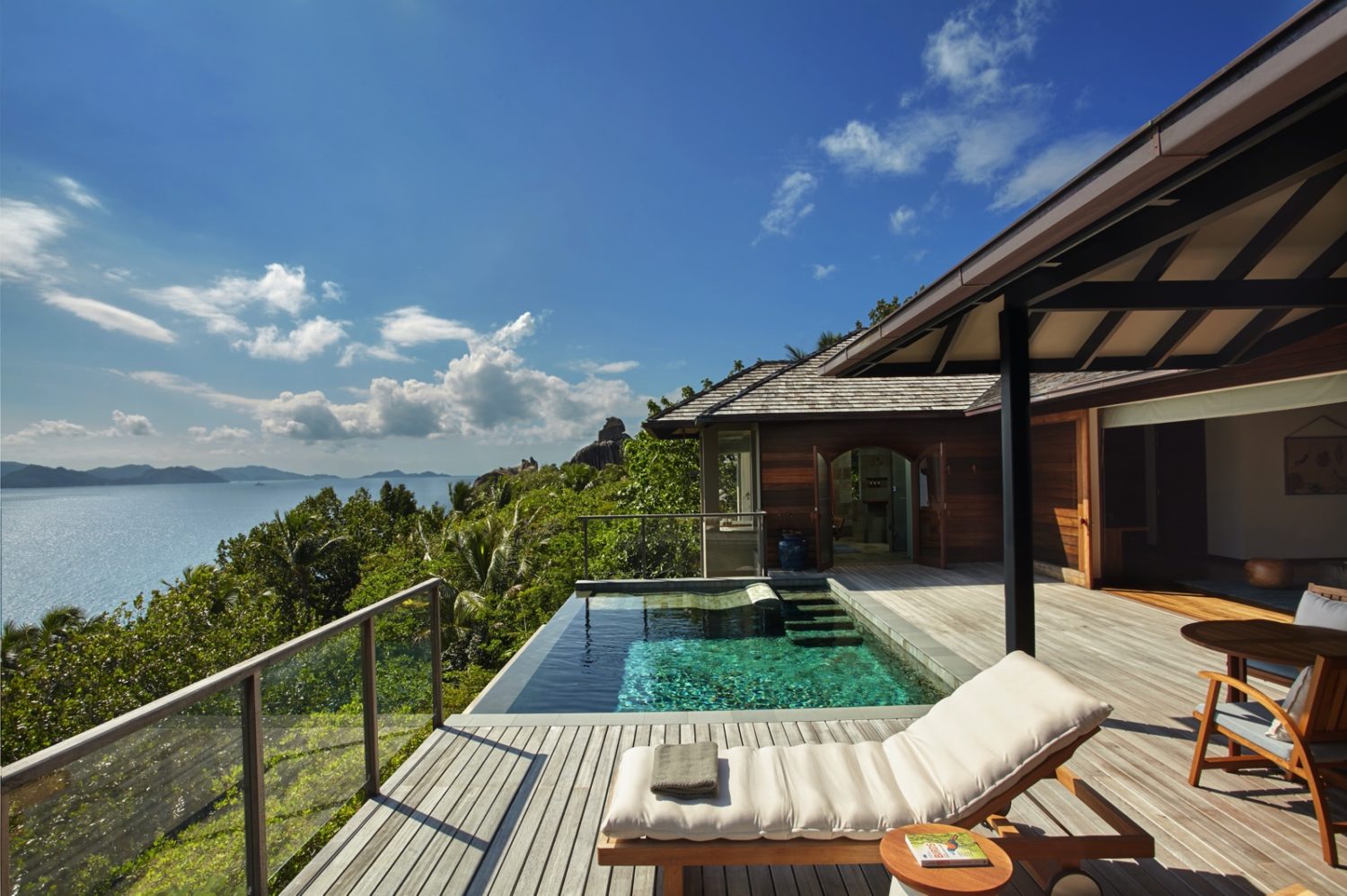Inmitten tropischer Vegetation erhöht auf der Ost -und Westseite des Resorts gelegen. Mit Blick auf den Indischen Ozean und die umliegenden Inseln. Mit geräumiger Außenterrasse mit Liegestühlen, Tagesbett und Esstisch sowie Infinity-Pool (20 Quadratmeter).