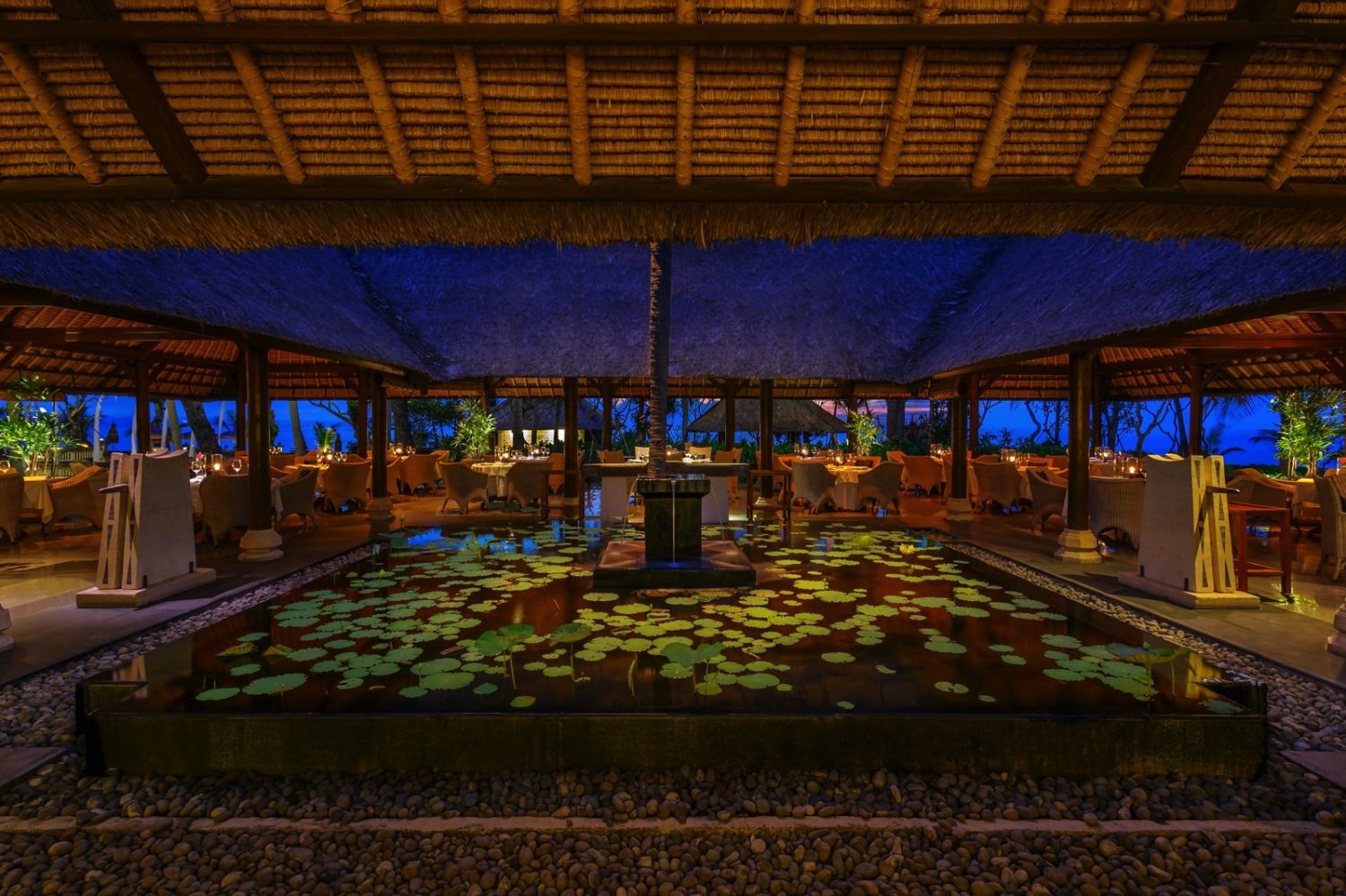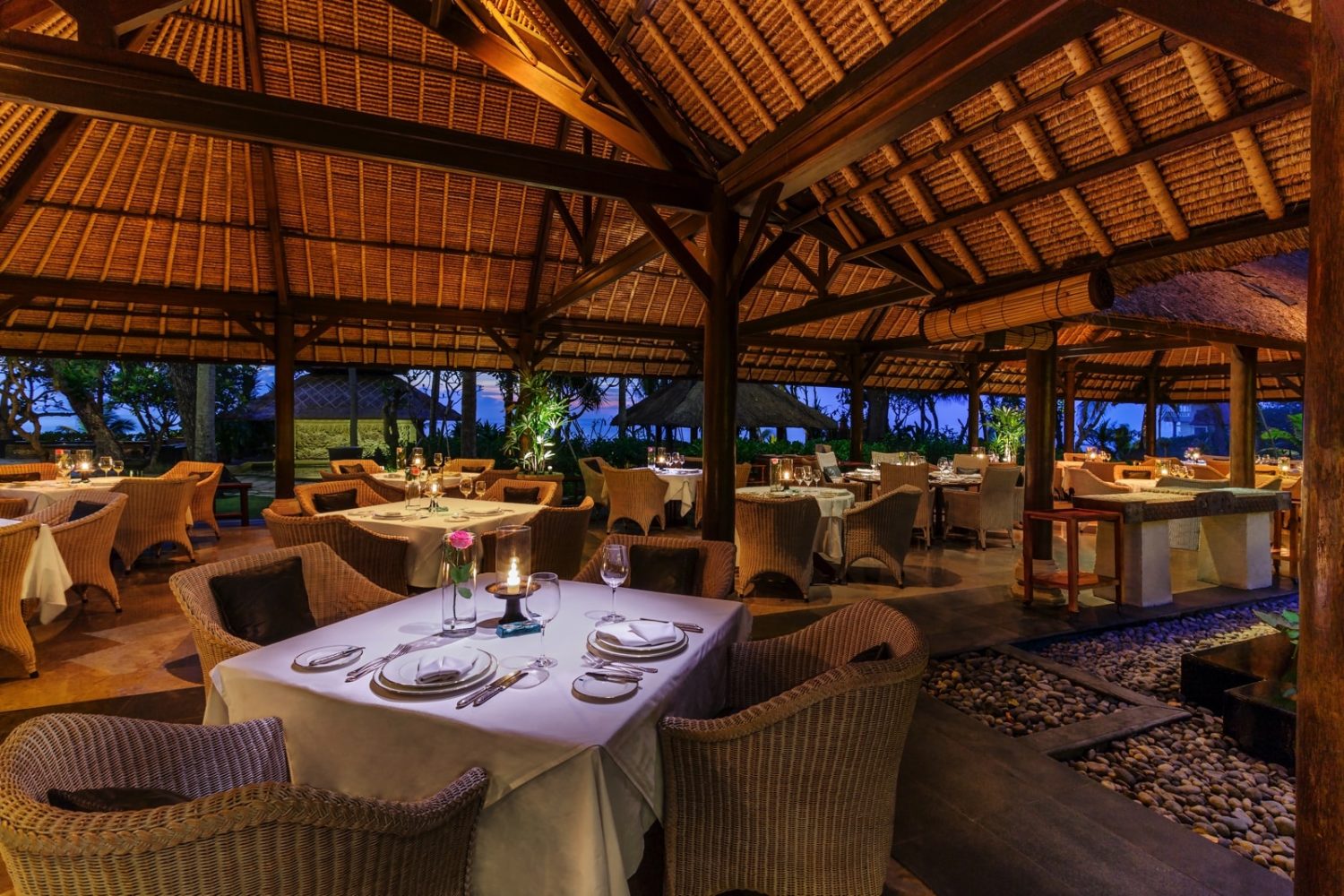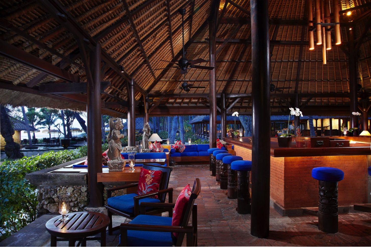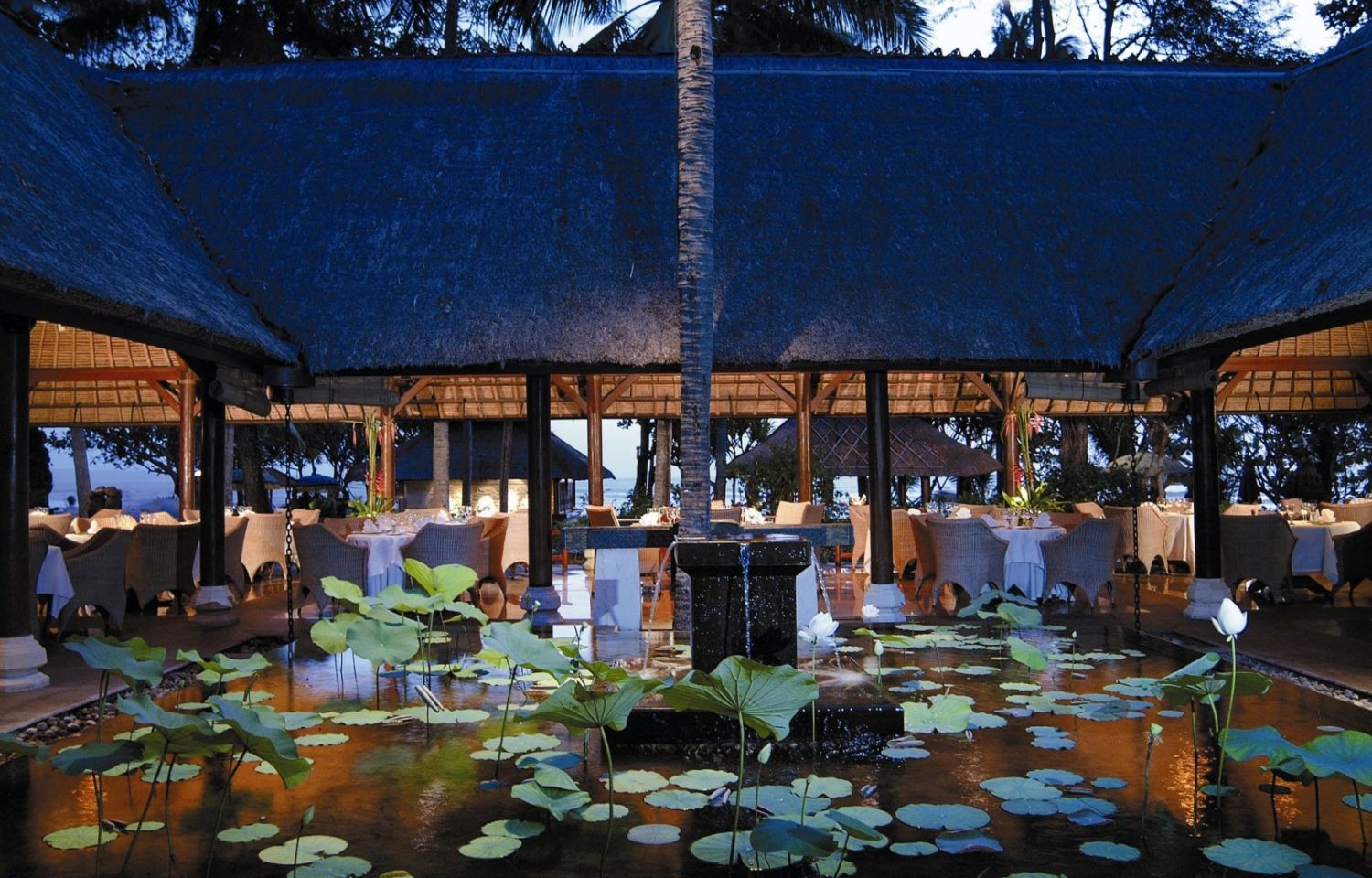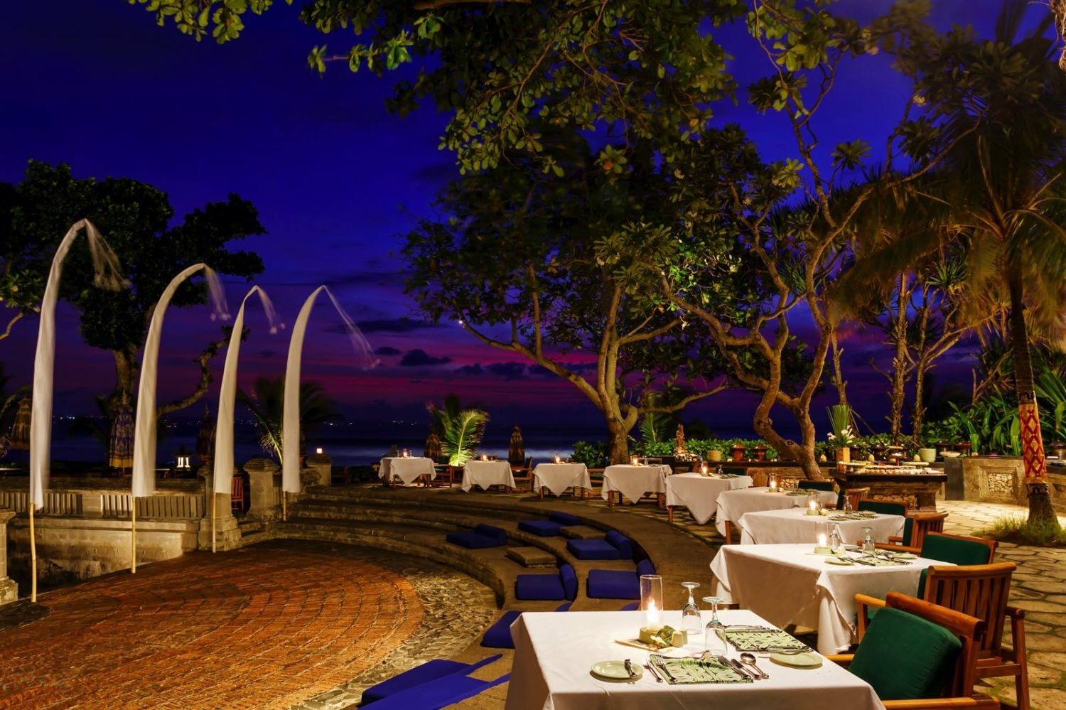 Zum Resort gehören zwei hervorragende Restaurants. Das malerisch am Strand gelegene, offene Frangipani Café serviert a la carte Frühstück, leichte Gerichte während des Tages und abends delikate Fischspezialitäten und das Kura Kura Feinschmeckerrestaurant bietet abends gehoben Küche (Asiatisch, Indonesisch, Indisch und kontinental) an. Die bis Mitternacht geöffnete Kayu Bar hat diverse Snacks und Erfrischungen auf der Karte, zudem werden im Amphitheater täglich Afternoon-Tea, Themenbuffets und regelmäßig balinesische Tanzveranstaltungen angeboten.