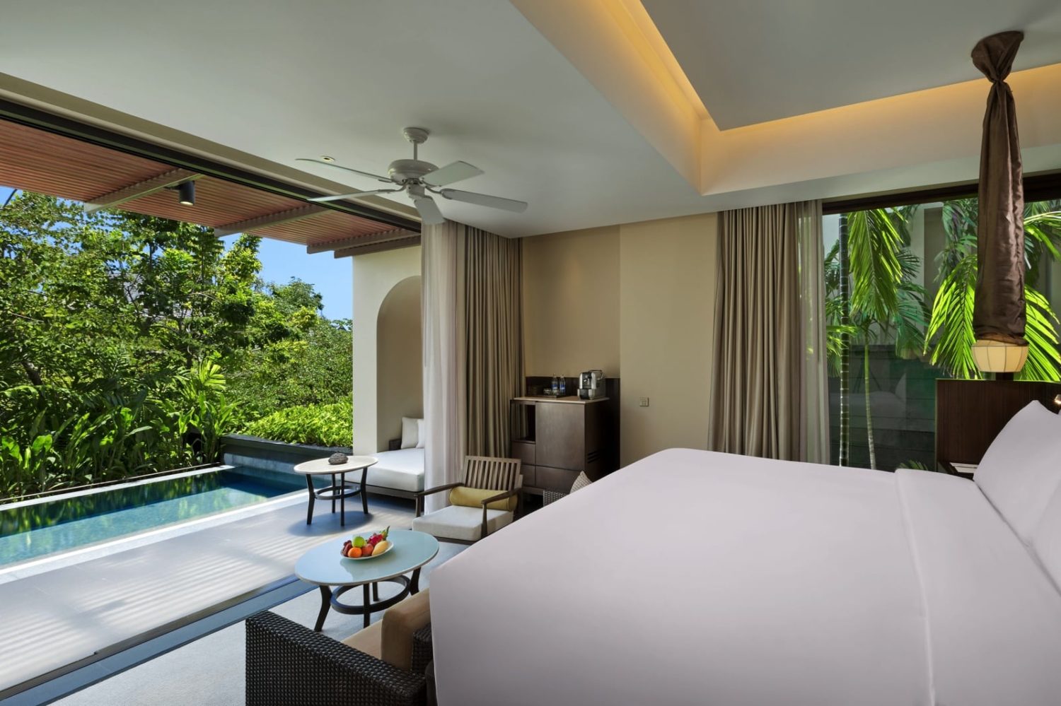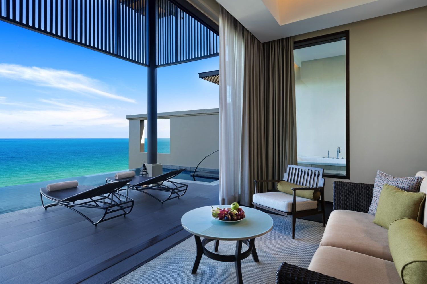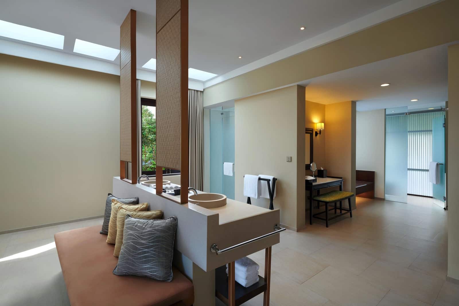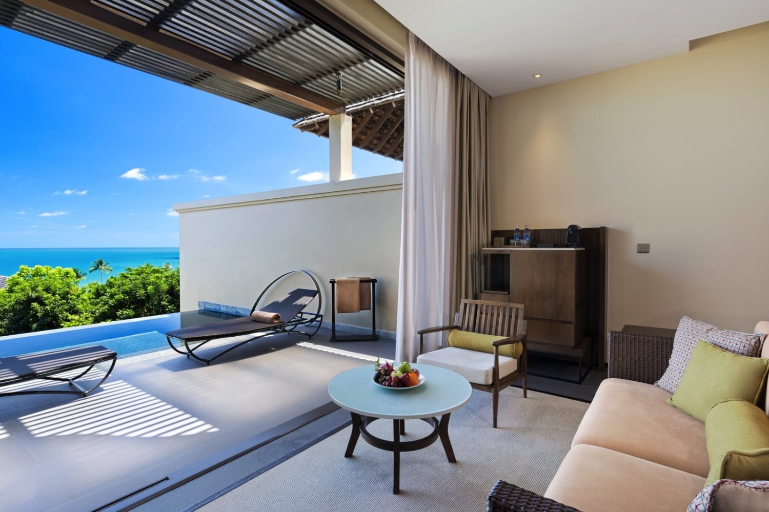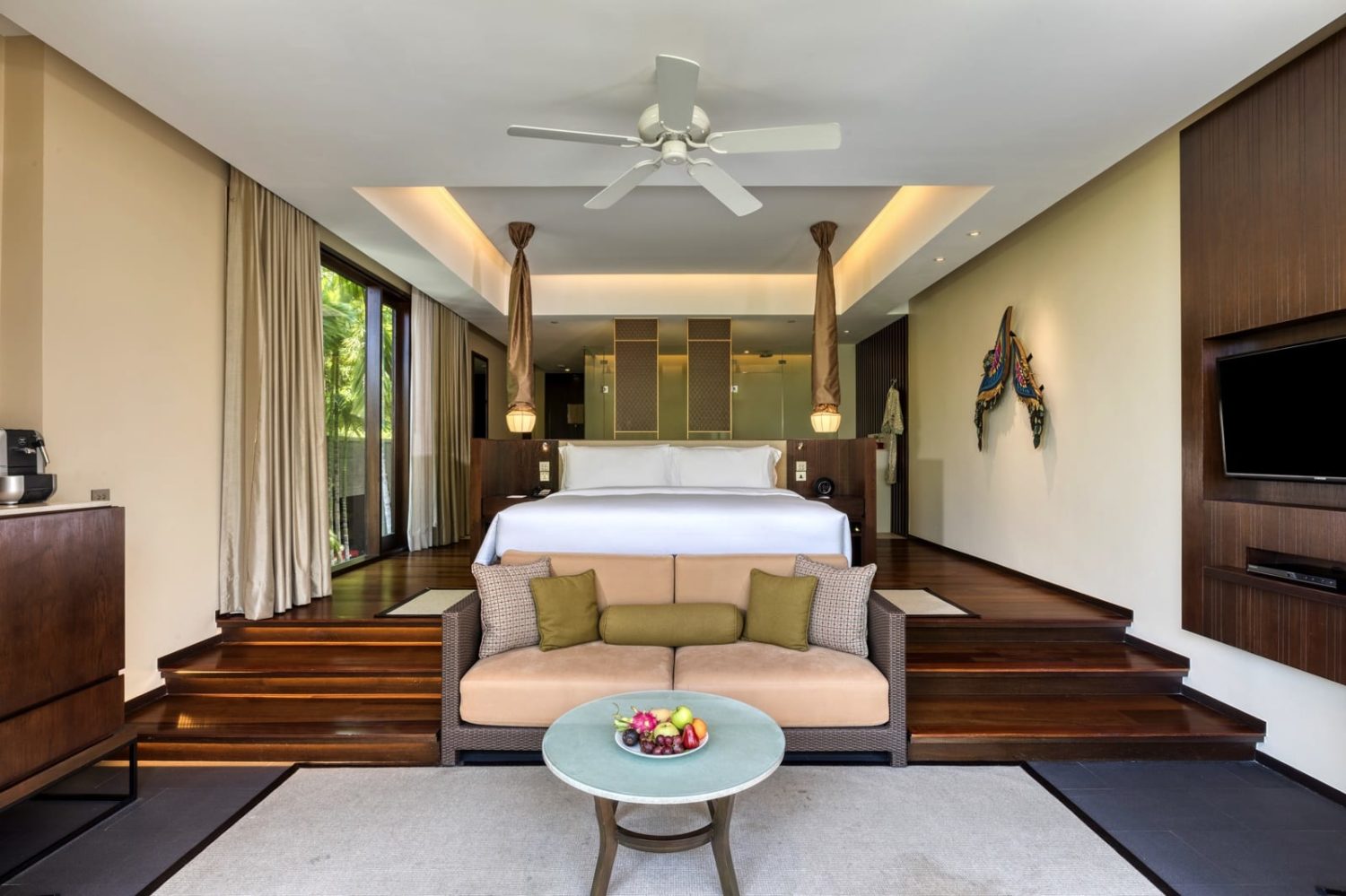 Zur Auswahl stehen Jungle One Bedroom Pool Suite (86 qm) mit Gartenblick, Ocean Pool One Bedroom Suiten (86 qm) mit eingeschränktem Meerblick, Premium Ocean Pool One Bedroom Suiten (86 qm) in oberen Etagen mit Meerblick, à la carte Frühstück und einem persönlichen Buttler-Service, Grand Ocean View Pool Suite (128 qm) mit zwei Sonnenliegen, einem größeren Pool (8 x 2,5 m) und Panorama-Meerblick. Während Ihres Aufenthalts in einer geräumigen Tropical Pool Villa (211 qm) und der frischrenovierten Vana Belle Ocean View Pool Suite (172 qm) steht den Gästen ein persönlicher Butler und zusätzlich ein à la carte Frühstück zur Verfügung.