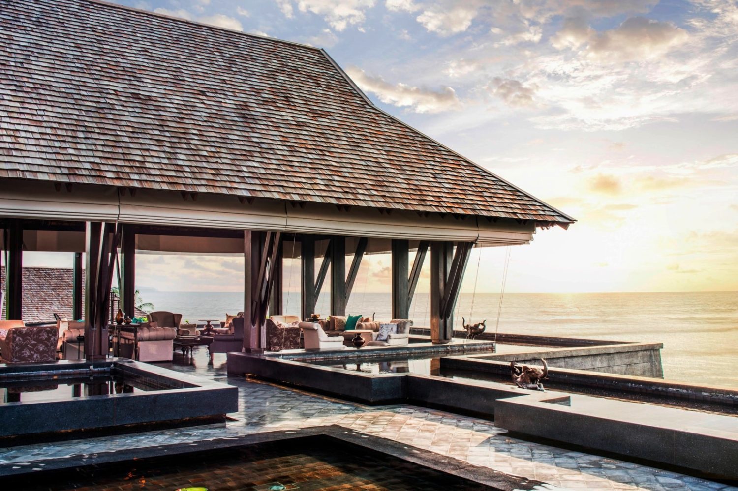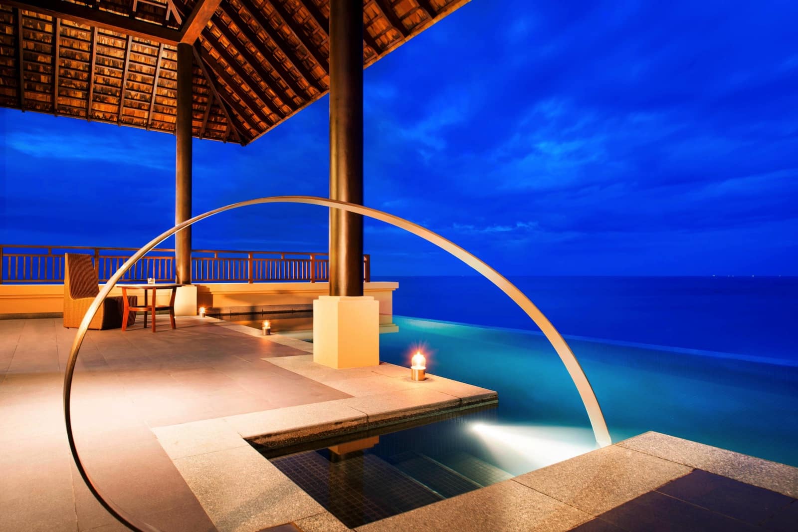 Der kristallklare Infinity-Pool liegt malerisch zwischen dem felsgesäumten Sandstrand und einem üppigen tropischen Wald.