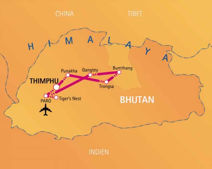 Auf dieser beeindruckenden Privatreise durch Bhutan besuchen Sie neben den Städten Paro, der Hauptstadt Thimphu, Gangtey und Punakha auch die Gegend um Bhumtang, einer der schönsten Regionen Bhutans. Auf Ihrem Programm stehen bedeutende Dzongs und Klöster, um einen Einblick in das religiöse Leben der Bhutanesen zu erhalten. Sehen Sie die traditionelle und mystische Lebensweise am Rande des Himalayas, wie sie in keinem anderen Land noch erhalten ist.
