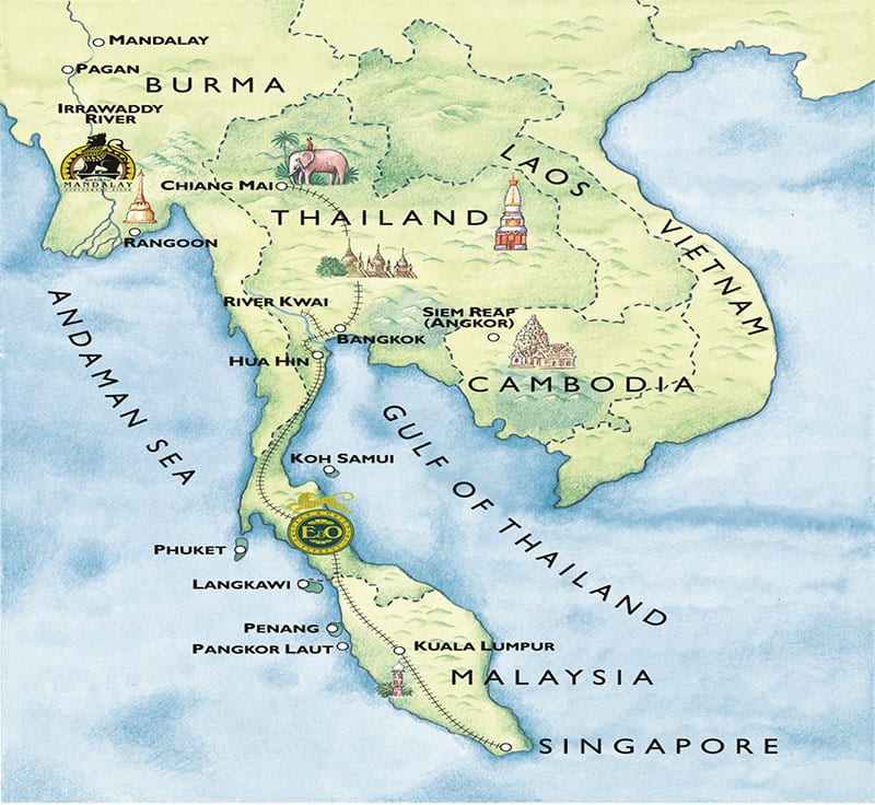 Der Eastern & Oriental Express steht wie kein anderer Zug für den Reise-Luxus der guten alten Zeit. Stilvoller kann man nicht durch Asien bummeln. Mit dem legendären Eastern & Oriental Express ist Reisenden zweimal ein unvergessliches Reise-Erlebnis gewiss: Zum einen garantiert die Ausstattung des Luxus-Zuges eine spannende Zeitreise in die goldenen 30er Jahre, zum anderen sorgt die Route durch die schöne Landschaft Südostasiens für ein Reise-Abenteuer der Superlative. Dazu trägt auch die Tatsache bei, dass man sich hier trotz ständiger Fortbewegung den Luxus der Entschleunigung leistet, denn der Zug fährt heute noch in „Originalgeschwindigkeit“. Am Bahnhof wartet Ihr livrierter Steward auf Sie und begleitet Sie zu Ihrer vollklimatisierten und komfortablen Kabine. Die Atmosphäre an Bord ist tagsüber entspannt, abends elegant. In den Speisewägen wird eine exquisite Küche auf hohem Niveau zelebriert.